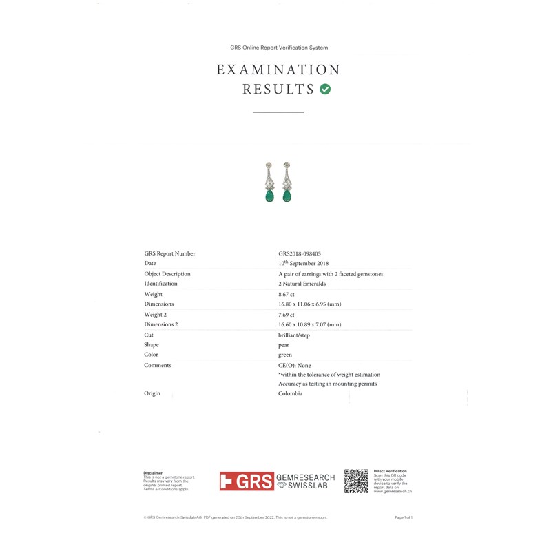 Accompanied by GRS report no GRS2018 - 098405 dated 10th September 2018 stating that the emeralds weighing 8.67 and 7.69 carats are of Colombian origin, with no indications of clarity enhancement