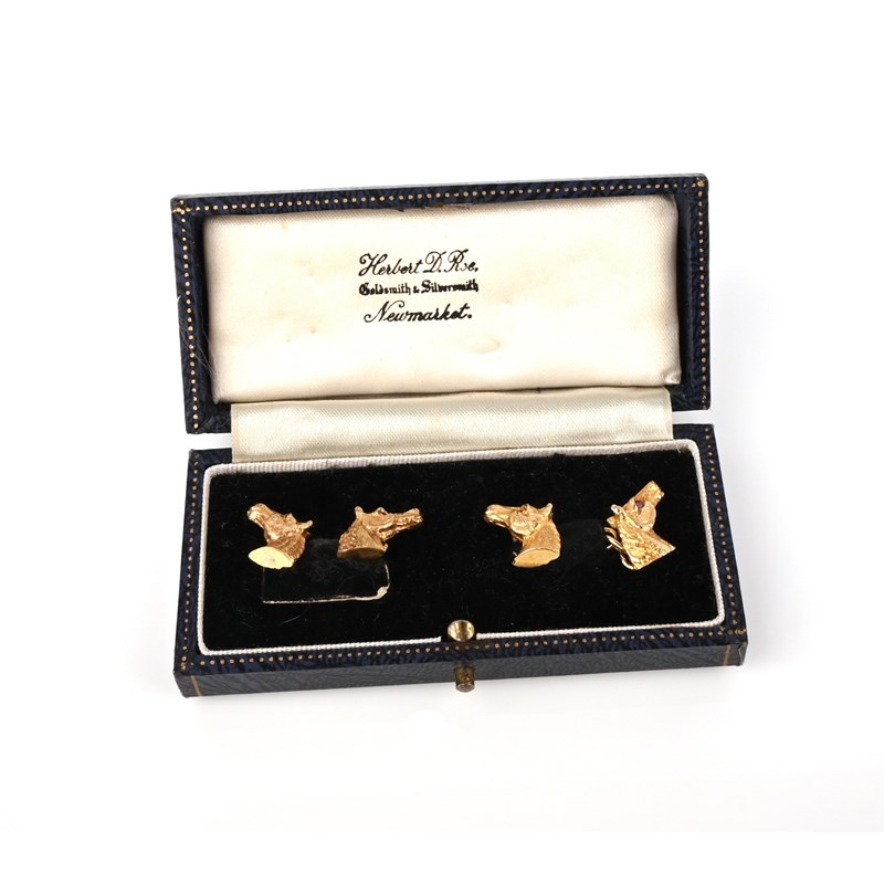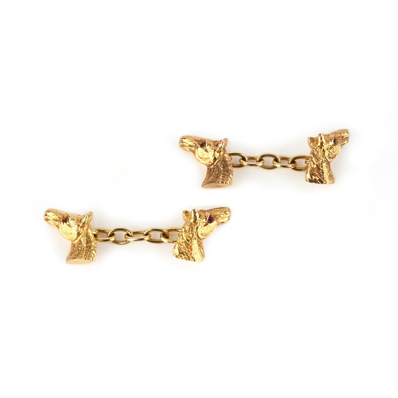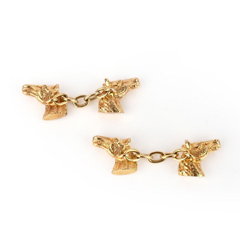 A pair of gold cufflinks, each end modelled as a horse's head, one eye accented with a ruby, to chain connections, length of each end 1.7cm, case