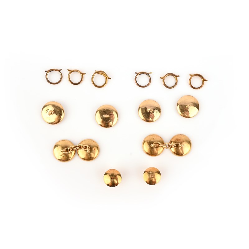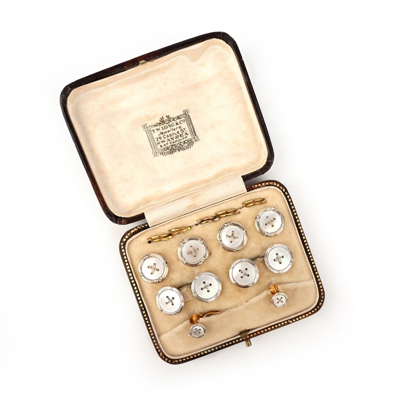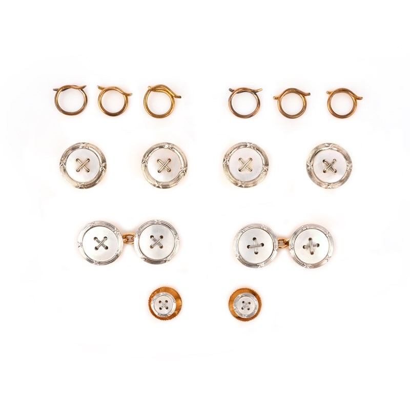 A cased mother of pearl dress set, comprising a set of cufflinks, buttons and studs, each with a central mother of pearl disc decorated with a stylised stitch within further stylised border in gold, fitted case