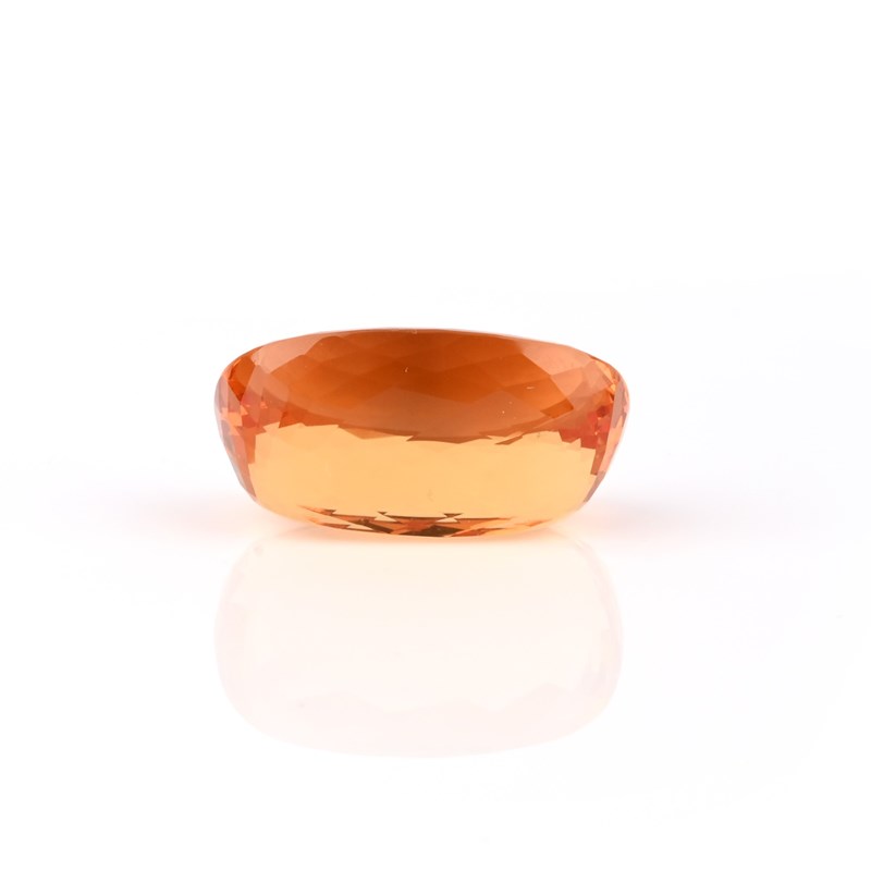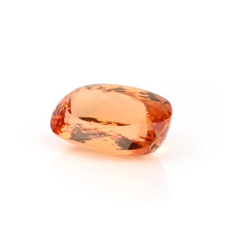 An unmounted topaz, the elongated cushion-shaped topaz of orange hue weighing 62.49 carats