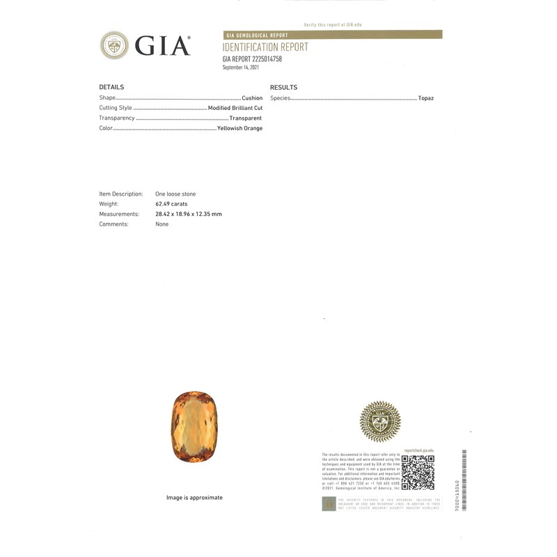 Accompanied by GIA report no. 2225014758 dated 14th September 2021 stating that the cushion shaped topaz weighs 62.49 cts.