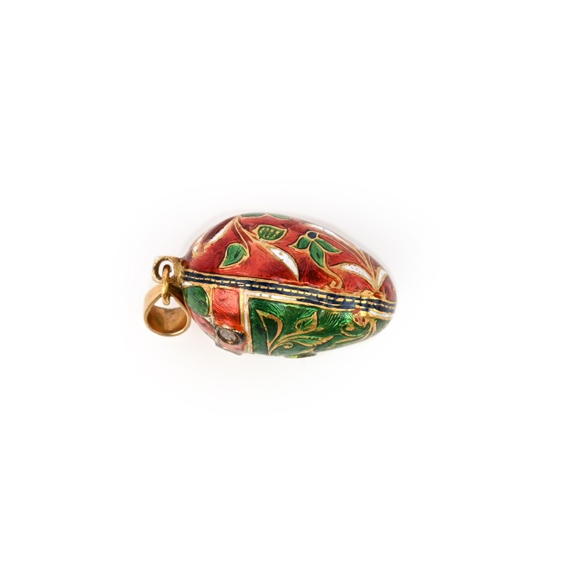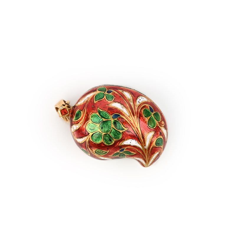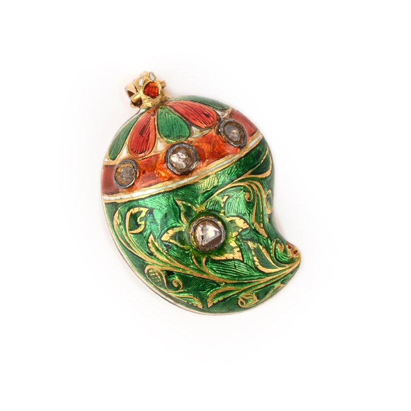An Indian enamel pendant, decorated with green and red enamel and set with diamonds, with gold pendant loop, 3.5cm high