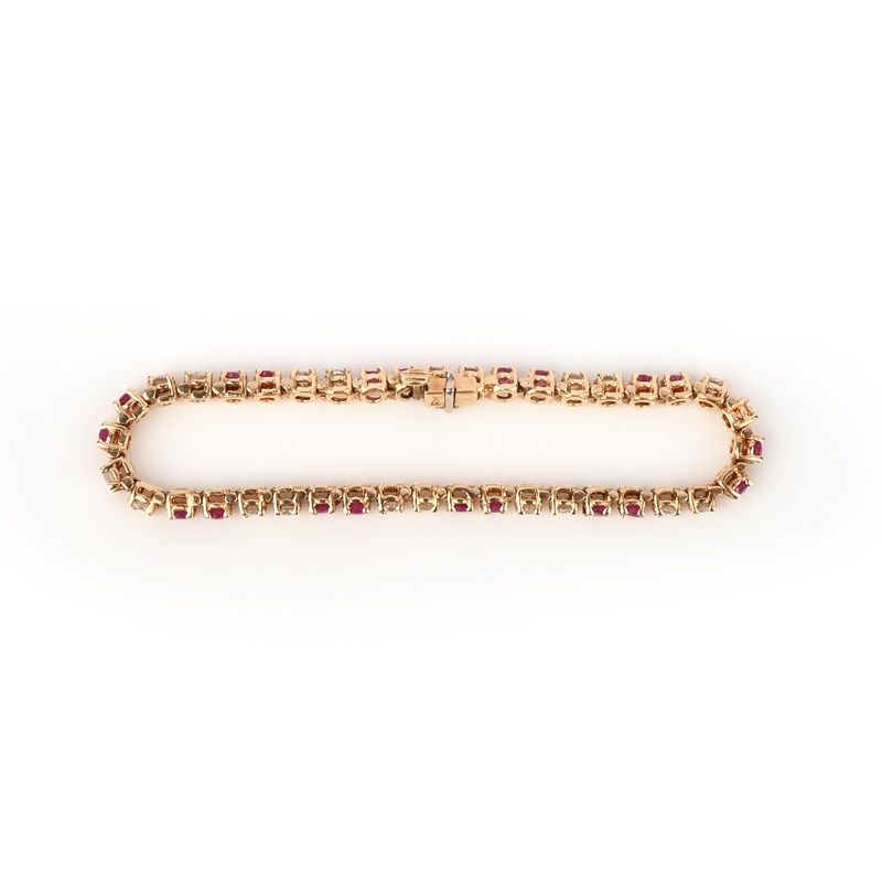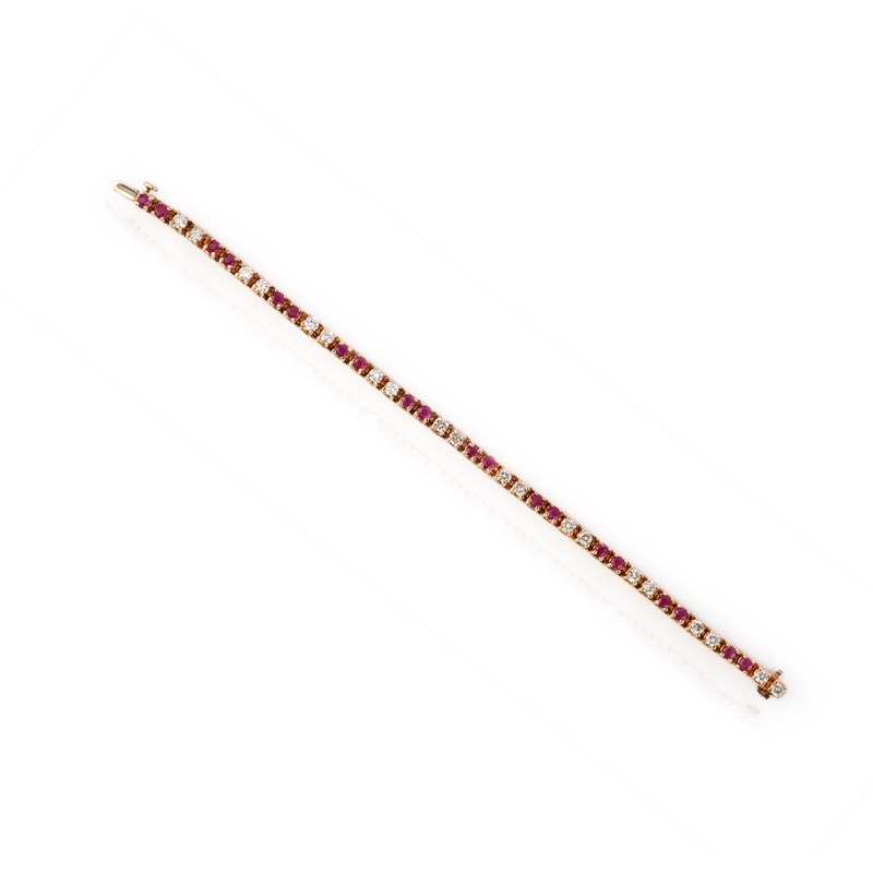 A ruby and diamond line bracelet, composed of articulated gold links set with circular-cut rubies and brilliant-cut diamonds, length 17.5cm, stamped 14K