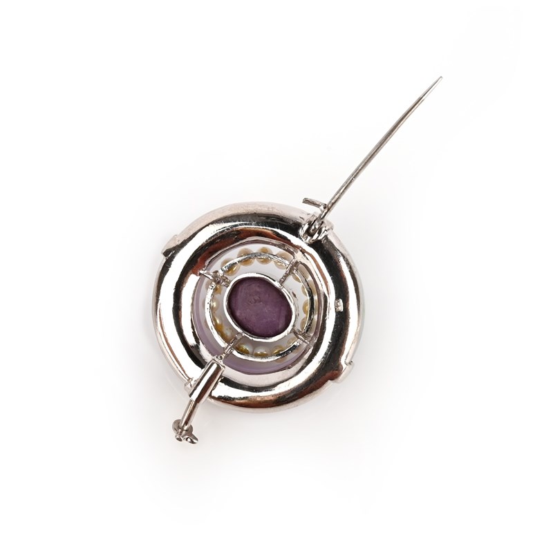A lavender jadeite, star ruby and cultured pearl brooch, the cabochon star ruby within a border of seed pearls, to an outer ring of carved lavender jadeite, mounted in white gold, diameter 3.5cm, stamped 18K