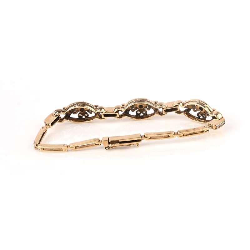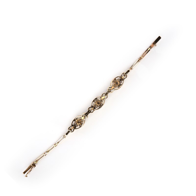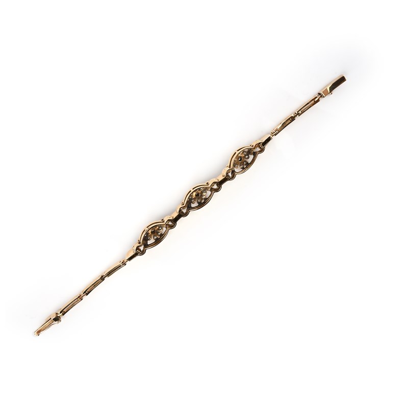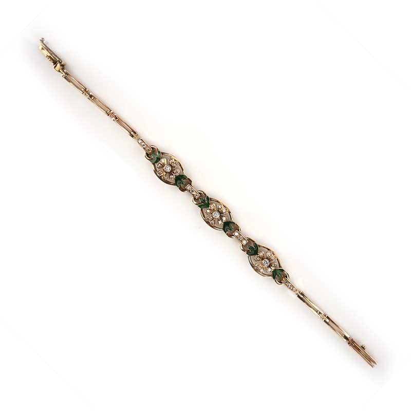 A gold, diamond and enamel bracelet, the front composed of floral links set with single-cut diamonds and accented with green enamel, the back of plain rectangular linking, length 17.3cm
