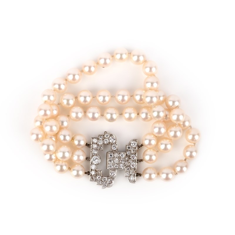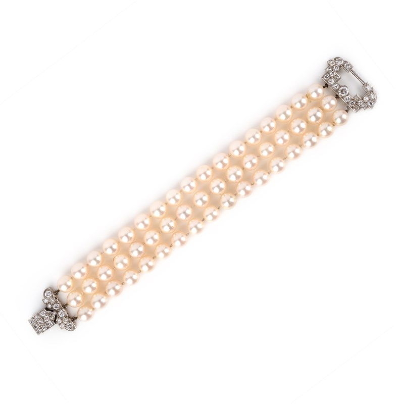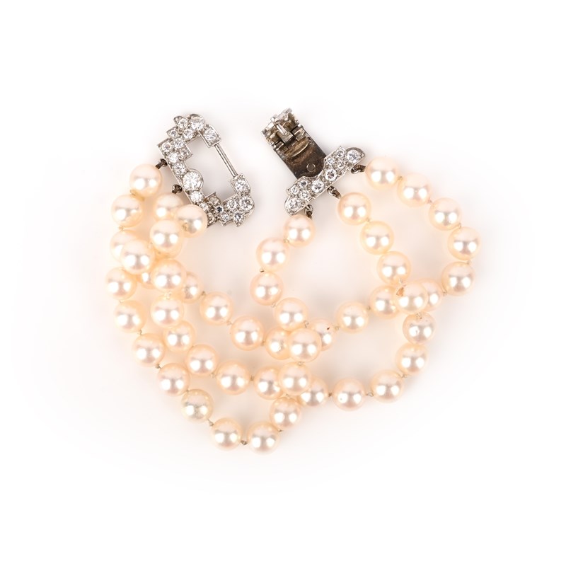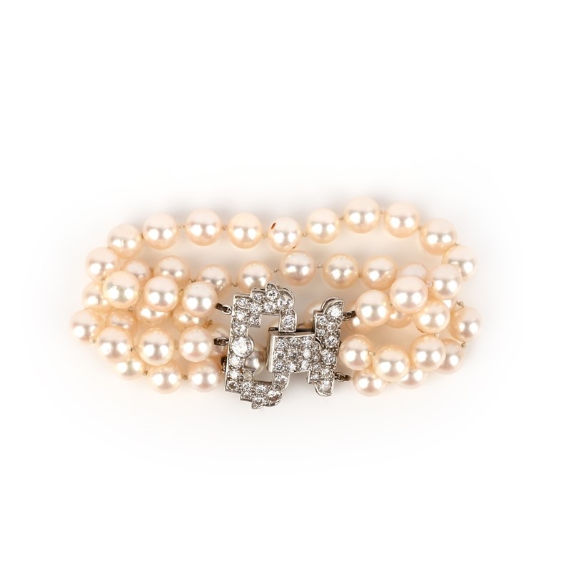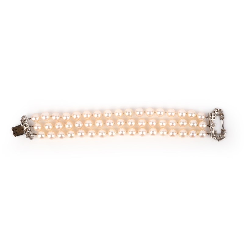 A cultured pearl and diamond bracelet, mid 20th century, composed of three rows of cultured pearls, to a clasp designed in the Art Deco style, set with brilliant-cut and circular-cut diamonds, length 17.2cm