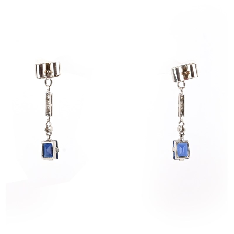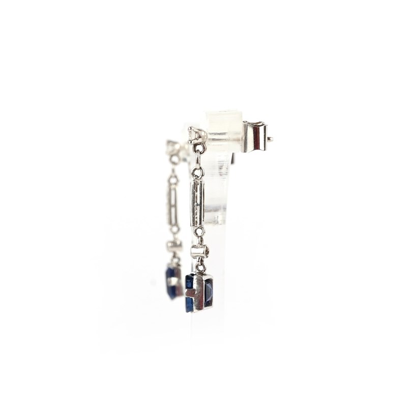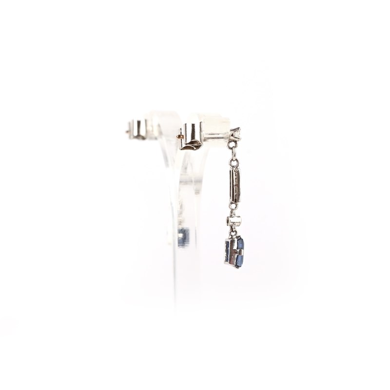 A pair of sapphire and diamond earrings, each of pendent design, suspending a step-cut sapphire from a line of brilliant- and single-cut diamond links, mounted in white gold, length 2.6cm, post fittings