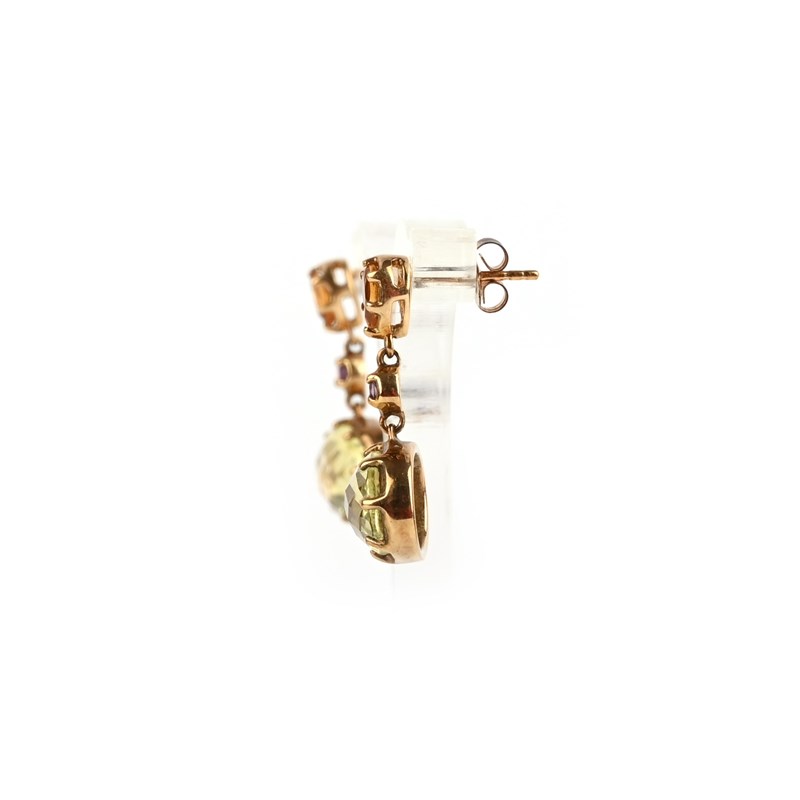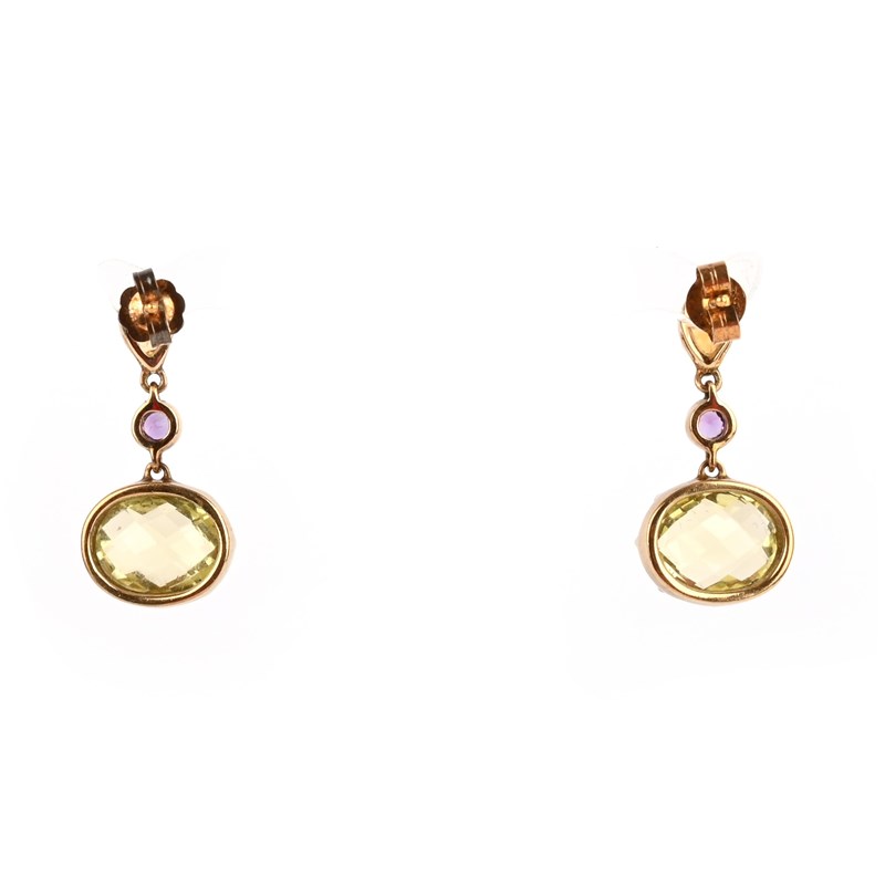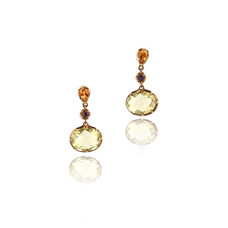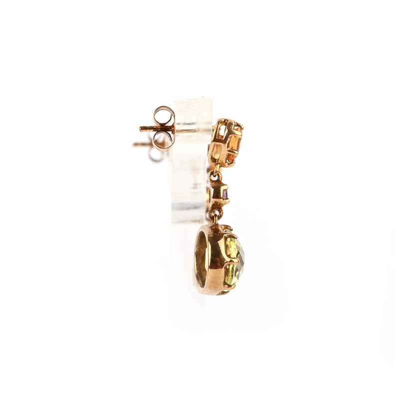 A pair of gem-set gold drop earrings, set with a citrine, amethyst and fancy-cut prasiolite in gold collets, 2.3cm high