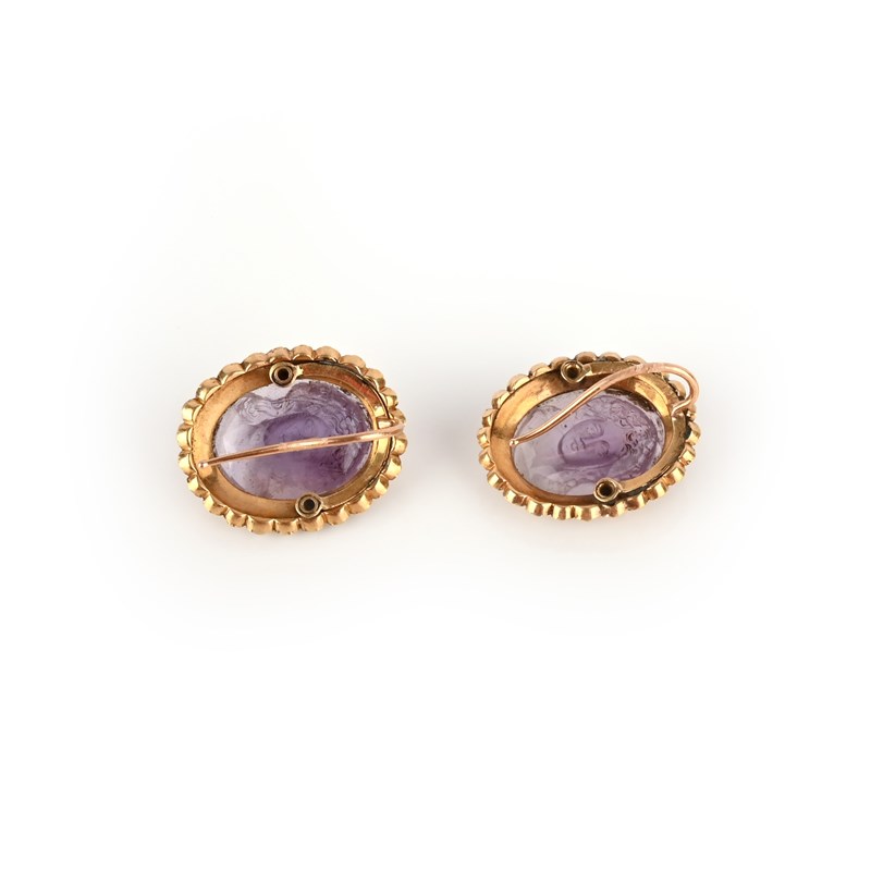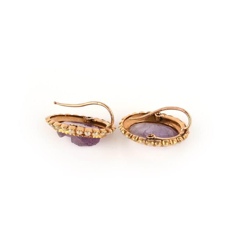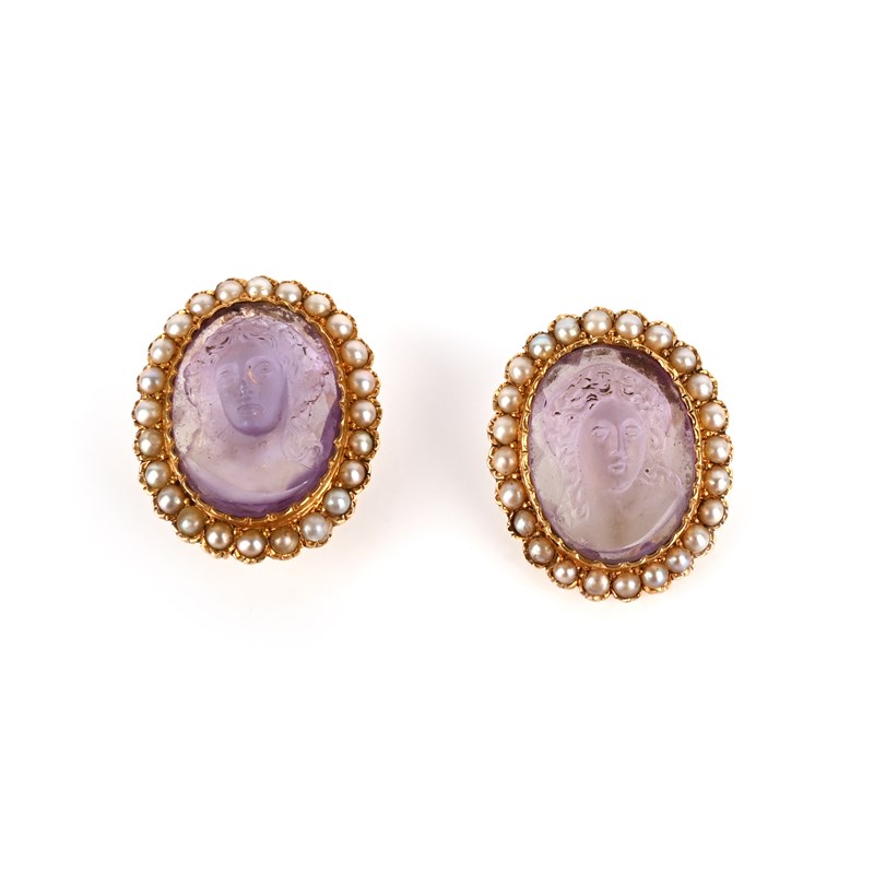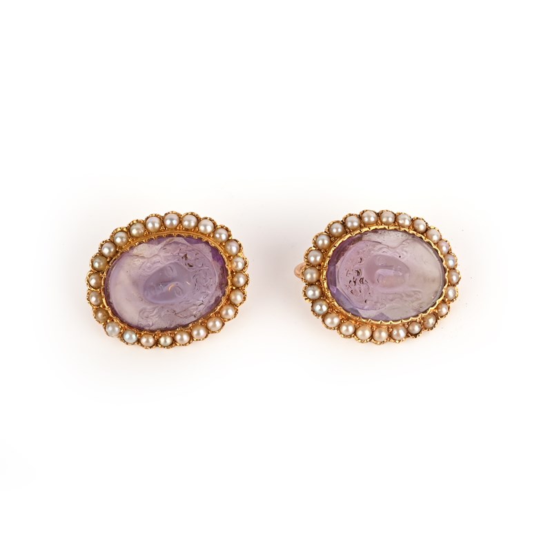A pair of amethyst cameo and seed pearl earrings, mid 19th century, each of cluster design, set with a carved amethyst cameo depicting a Bacchante, within a border of half seed pearls, mounted in gold, length 2.7cm, each cameo 1.9 x 1.5cm, later hook fittings