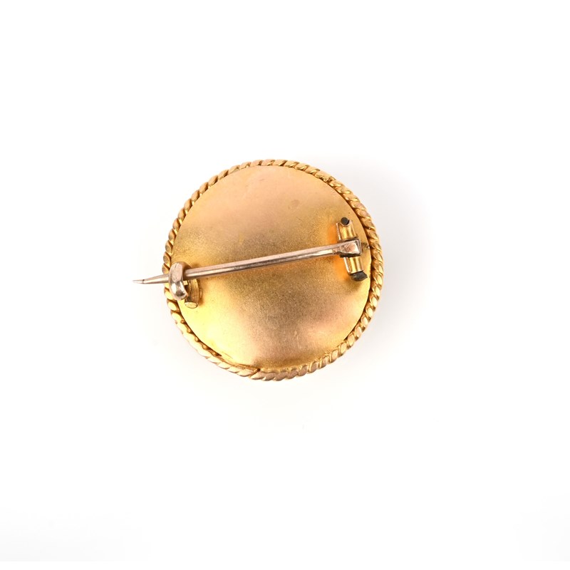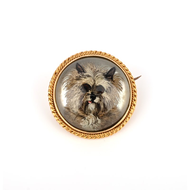 A rock crystal reverse intaglio brooch, late 19th century, the circular domed rock crystal carved in reverse and painted with an intaglio of a terrier, within a gold ropetwist border, diameter 2.3cm