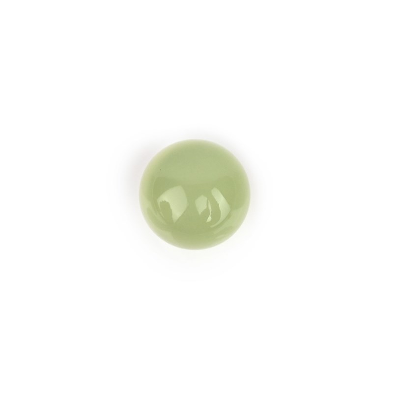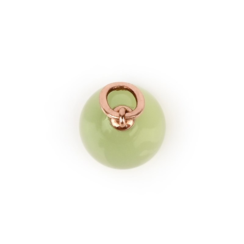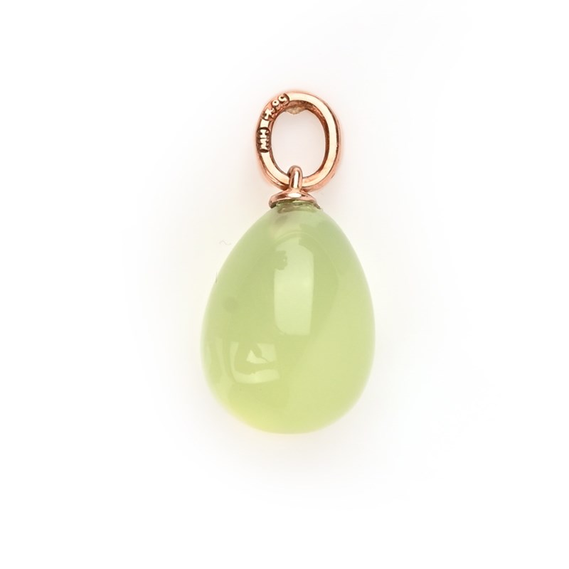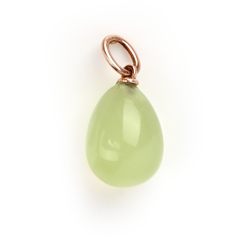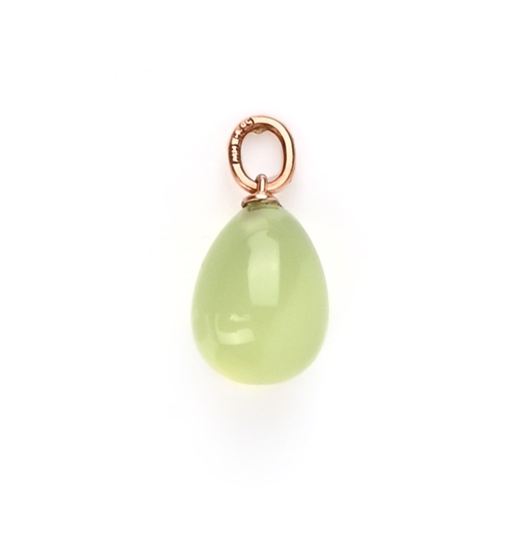 A Russian phrenite egg pendant, ealy 20th century, of polished phrenite, to a gold pendant hoop, length 2.5cm, Russian assay mark and workmaster's mark for Henrik Wigström