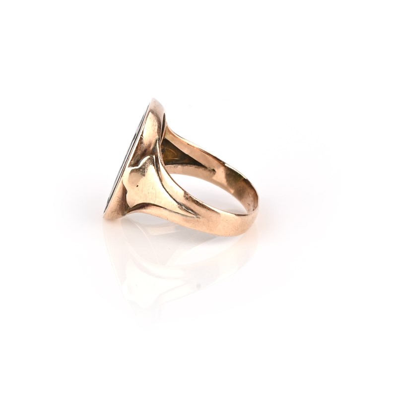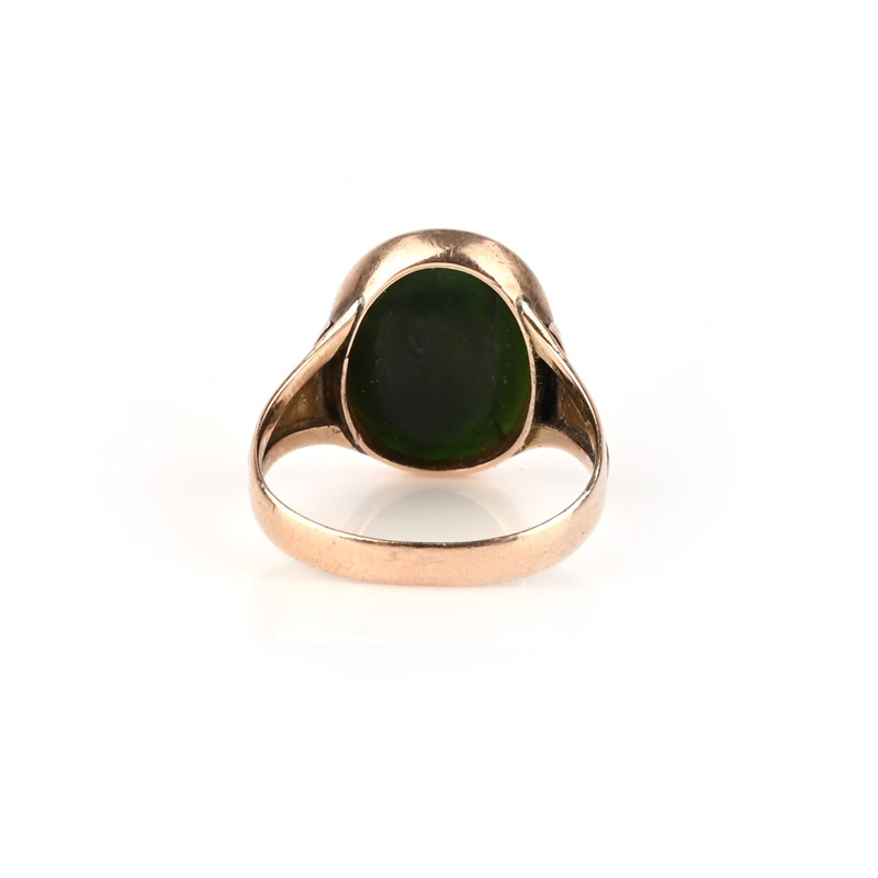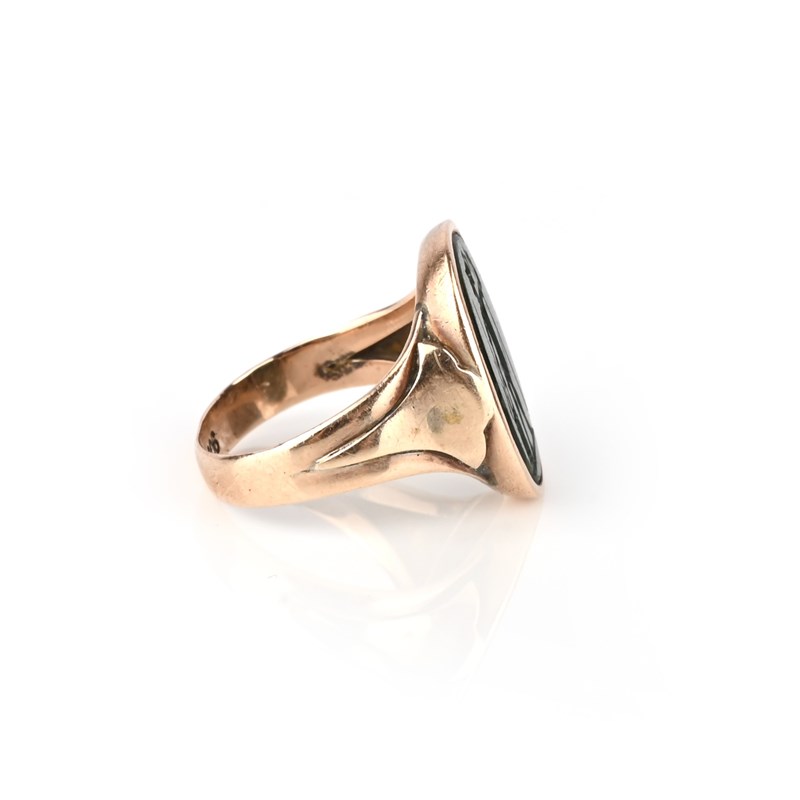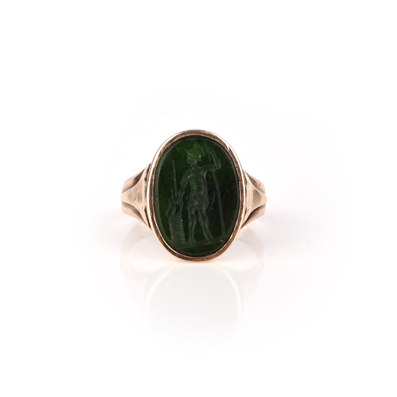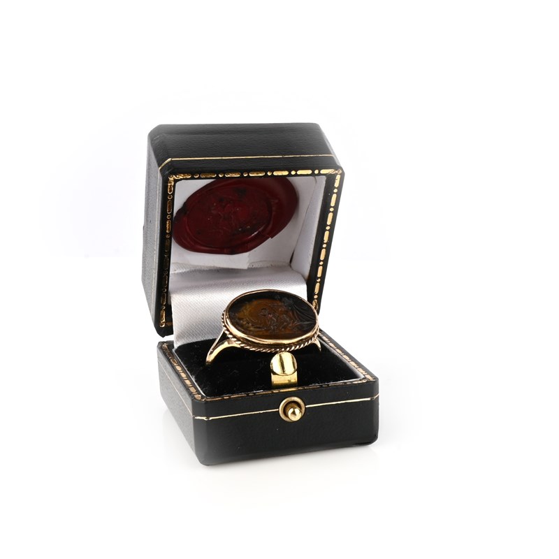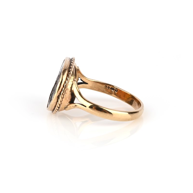 A glass intaglio ring, probably William Tassie, 19th century, the brown glass intaglio featuring an erotic scene, to a later 9ct gold ring mount, size W, British hallmarks, case