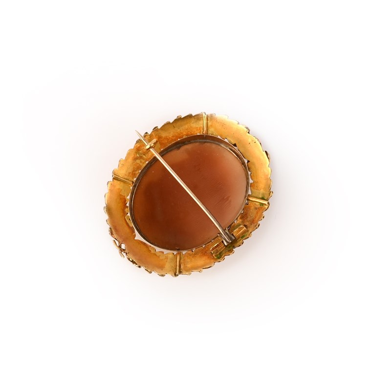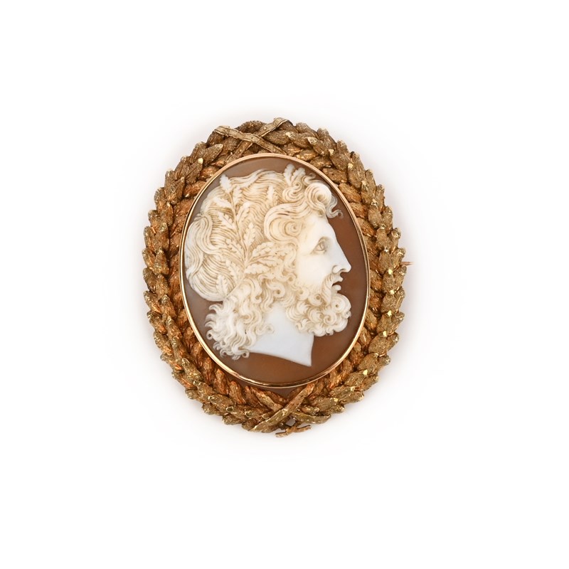 A shell cameo brooch, 19th century, the shell cameo carved to depict Zeus, within an engraved gold border designed as a laurel wreath, overall dimensions 4.9 x 3.9cm