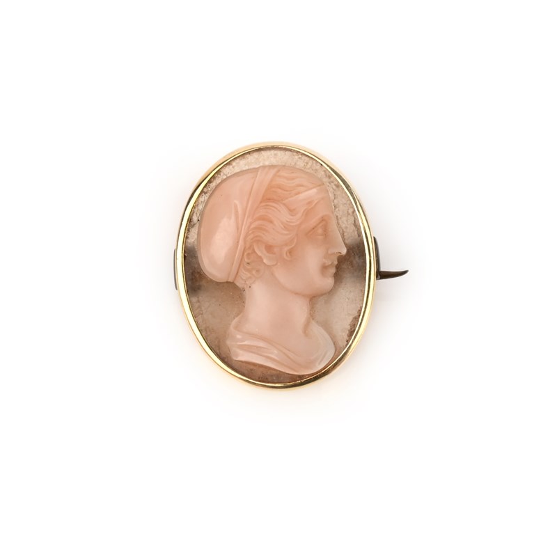 A hardstone cameo brooch, 19th century, the layered chalcedony carved to depict a woman in profile, within a plain gold border, overall dimensions 2.5 x 2.0cm