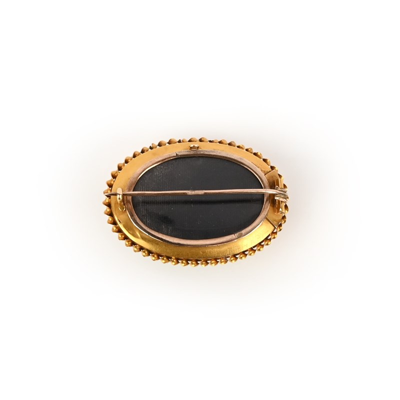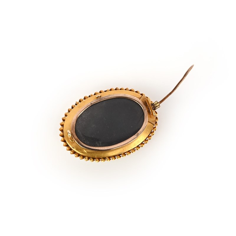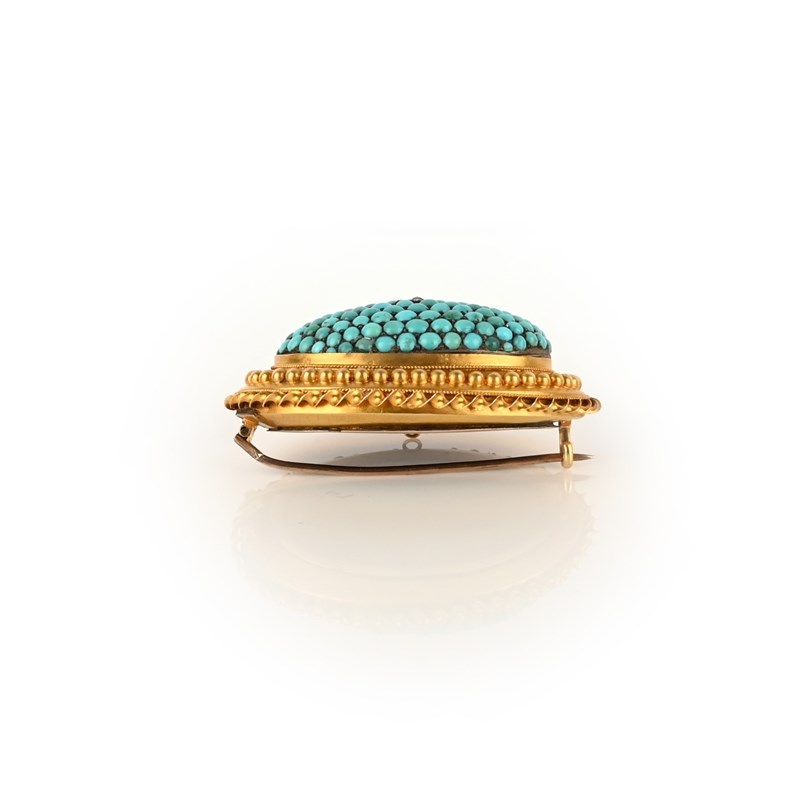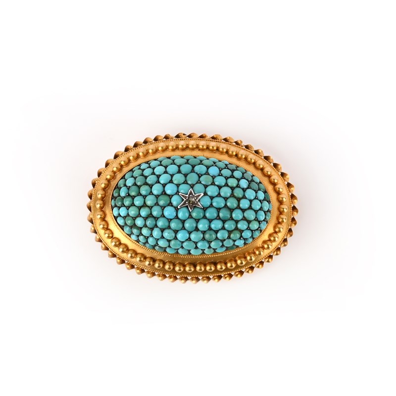 A gold, turquoise and diamond locket brooch, 19th century, of oval outline, centring on a star motif set wth a rose-cut diamond, to a section of pavé-set turquoise cabochons, within a bead and twisted knifewire border, the reverse with a glazed compartment, length 4.8cm