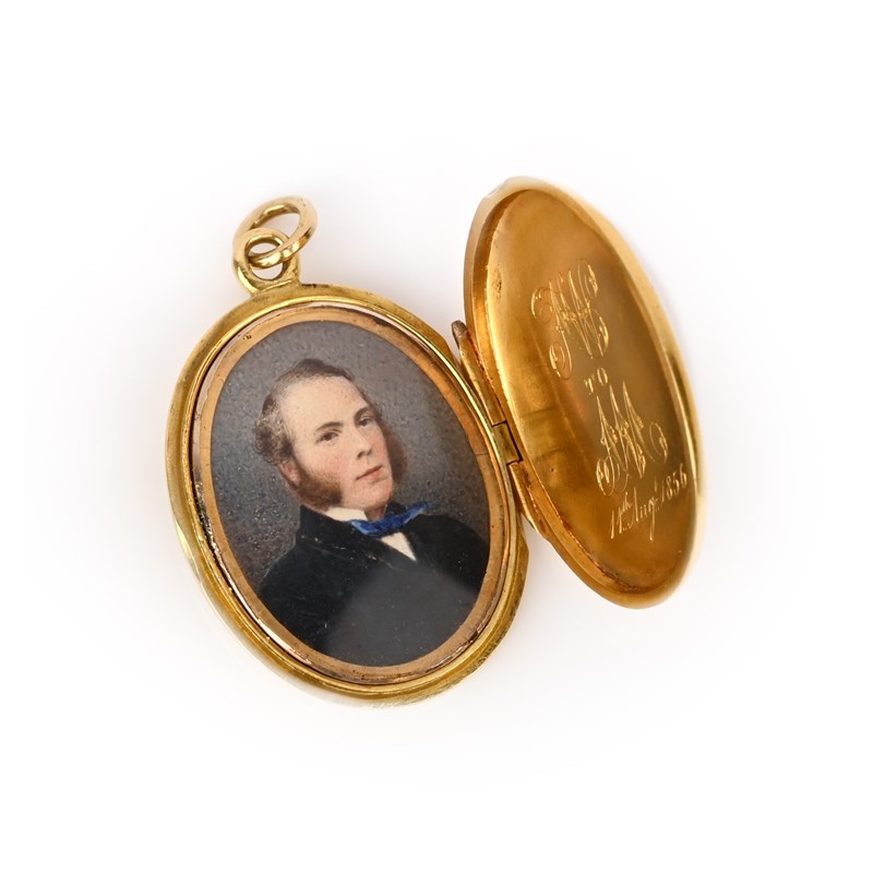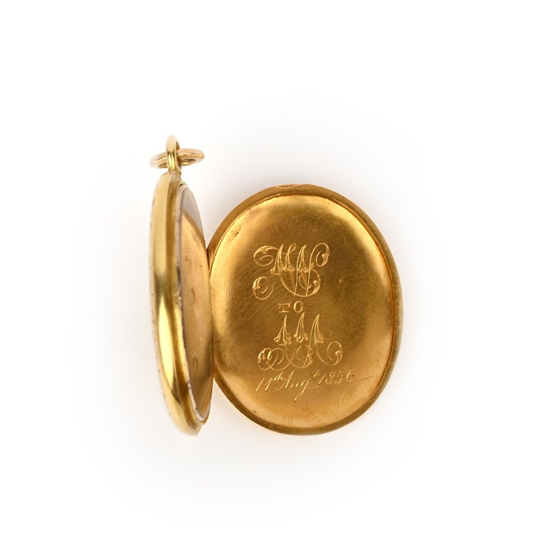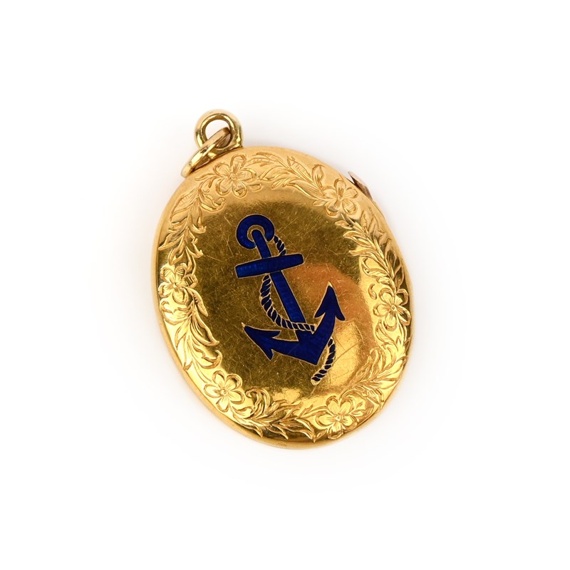 A gold, enamel and diamond locket pendant, mid 19th century, the oval gold locket with a design of a flower in reserve against blue enamel, its petals set with rose-cut diamonds, the reverse with an anchor in blue enamel, each within a border of incised floral scrolls, opening to reveal a portrait miniature and the inscription 'AW to AM, 11th August 1856', length 3.8cm including bail