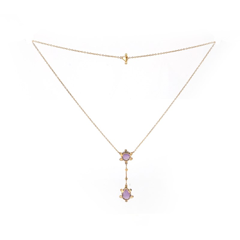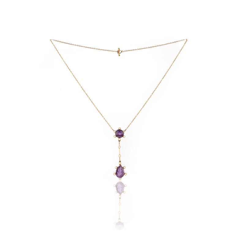 An amethyst and seed pearl pendant, circa 1900, composed of a circular-cut amethyst suspending a pear-shaped amethyst from a knife wire link, accented with seed pearls, to a fine gold chain, pendant length 5.6cm, necklace length 41cm