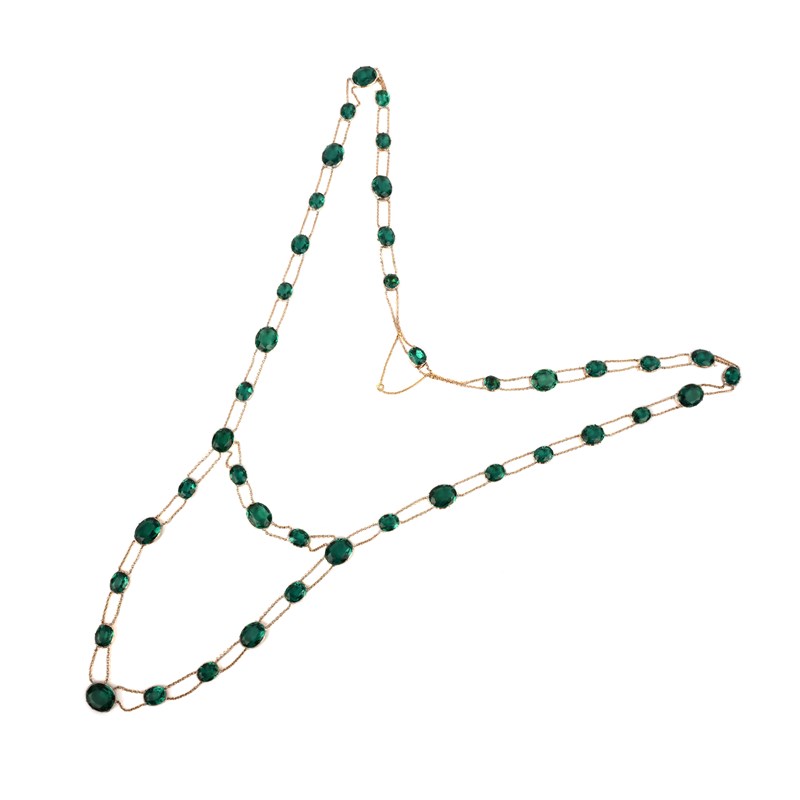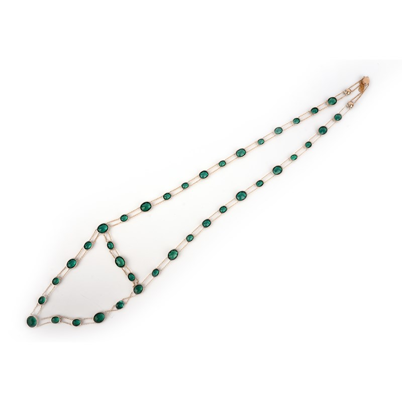 A green paste necklace, 19th century and later, designed as a long chain with a festoon to the front, composed of collet-set green pastes connected by two strands of fine gold chain, length 88cm