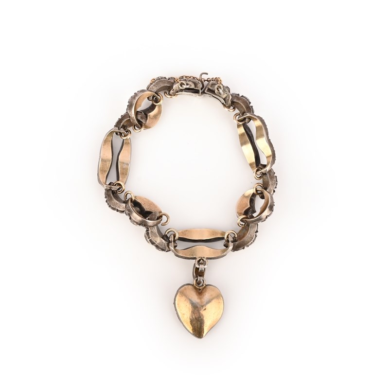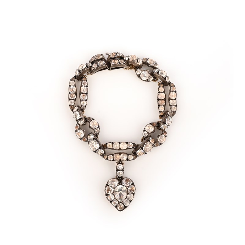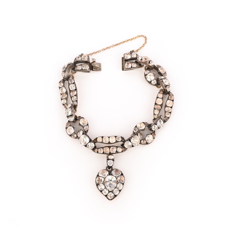 An early 19th century paste bracelet, suspending an articulated paste-set heart in closed-back silver settings, 15cm long