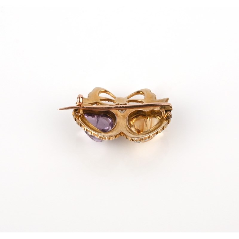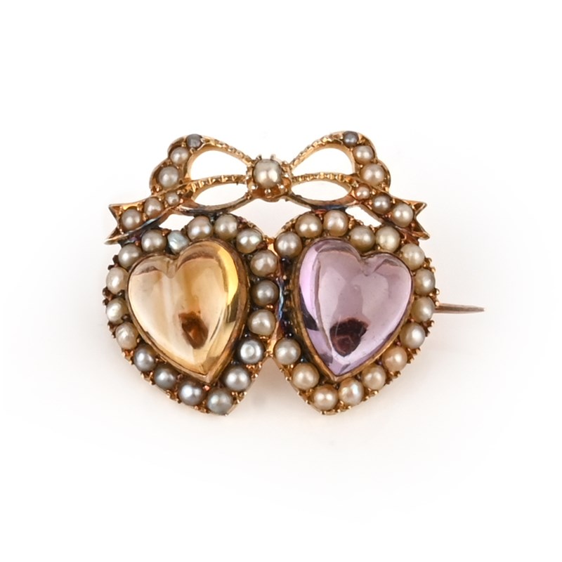 An Edwardian citrine and amethyst heart brooch, the cabochon hearts set within seed pearl surrounds beneath a seed pearl bow in yellow gold, 2.5cm wide