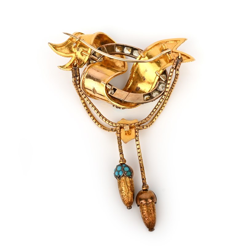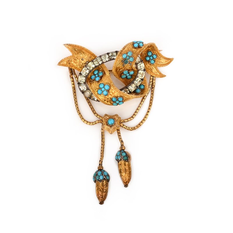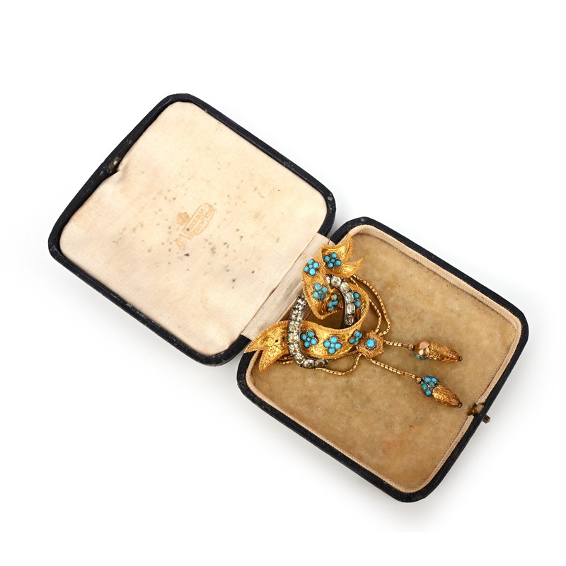 A fine gold, turquoise and chrysoberyl brooch, circa 1850, designed as an undulating gold ribbon engraved with floral scrolls and applied with floral motifs of turquoise cabochons, threaded through a ring of cushion-shaped chrysoberyls, suspending a snake chain festoon and two drop pendants set with additional turquoise cabochons, length approximately 8.5cm, one turquoise flower motif deficient