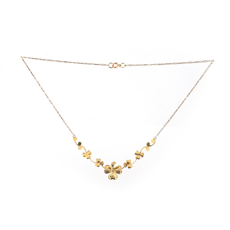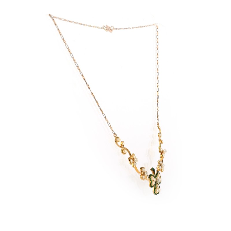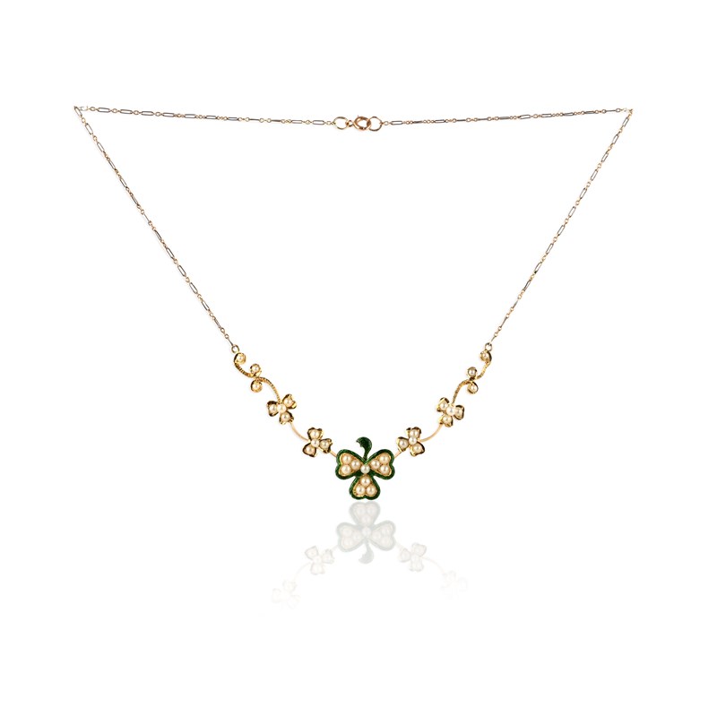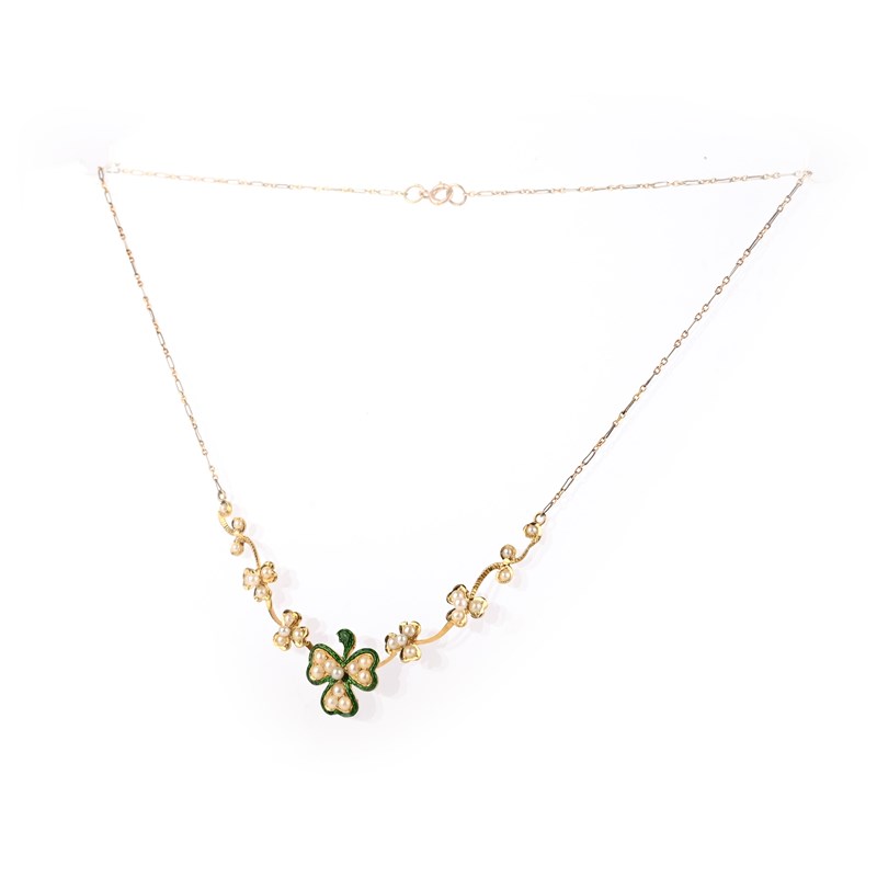 A seed pearl and enamel necklace, early 20th century, the front of knife wire construction, designed as a graduated line of shamrocks, the central shamrock applied with green basse taille enamel, to bicoloured gold backchain, length 40cm, stamped 750, pearls untested