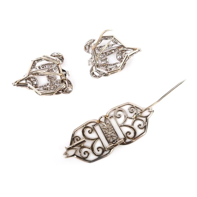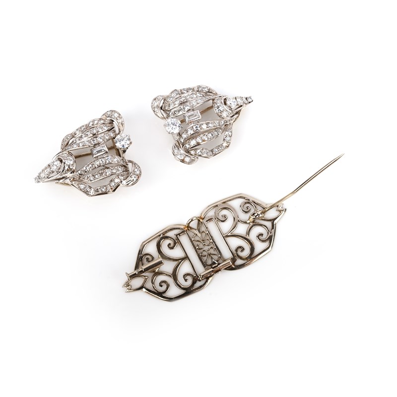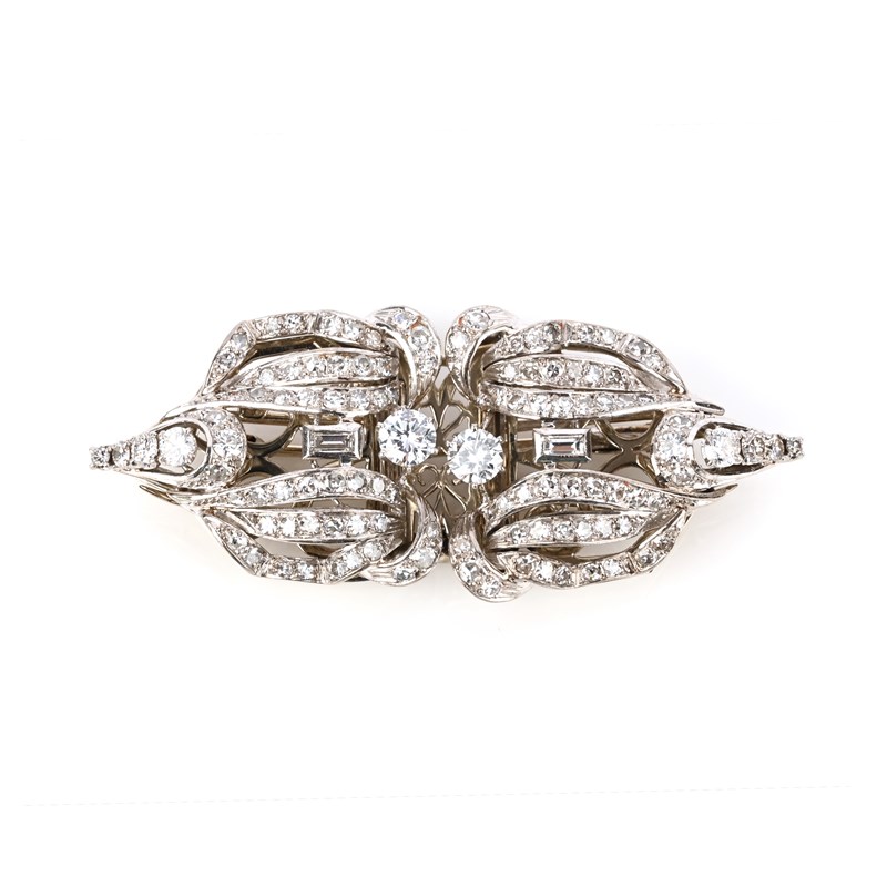 A diamond double clip brooch, France, mid 20th century, each of foliate design, set with brilliant- and single-cut diamonds, together with a brooch fitting allowing them to be worn together, mounted in white gold, combined length 5.8cm, French maker's mark FR with torch
