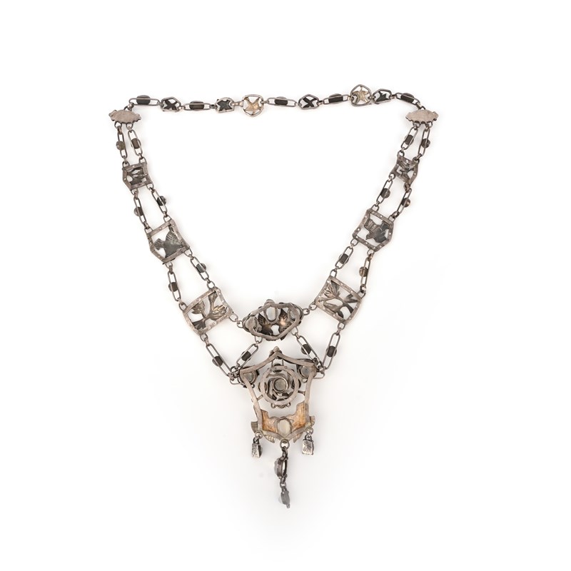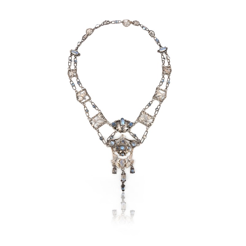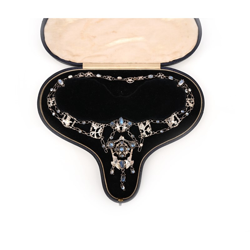 An Arts and Crafts silver and moonstone necklace, early 20th century, composed of links with designed of birds and plants, set with cabochon moonstones, length 44cm, case
