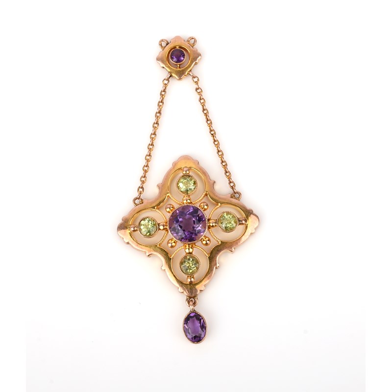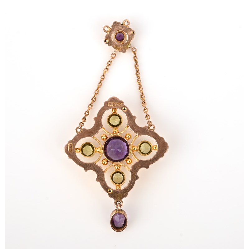 A Murrle Bennet, Arts & Crafts peridot and amethyst pendant, of quatrefoil design, set with a central amethyst and circular-cut peridots in 9ct gold, with amethyst drop and suspending from fine link gold chains and a further amethyst plaque, maker's mark to reverse, 5.8cm high