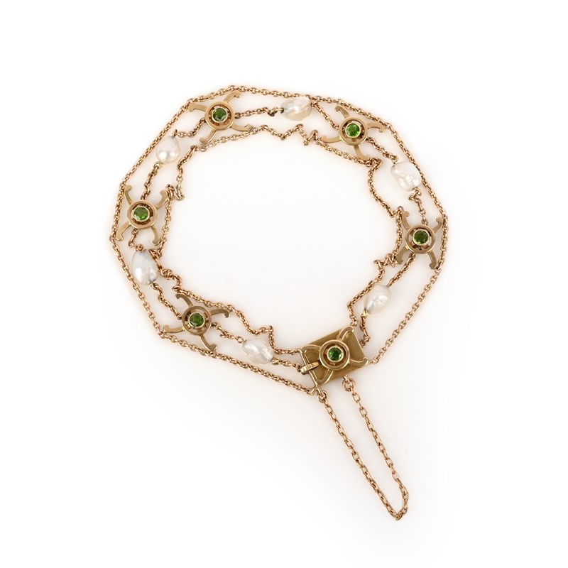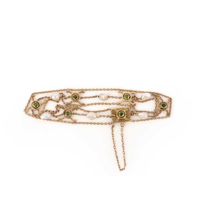 A pearl and demantoid garnet bracelet, early 20th century, designed as three gold chains connecting crossed links set with circular-cut demantoid garnets, spaced by pearls, length 16.8cm, stamped 15CT