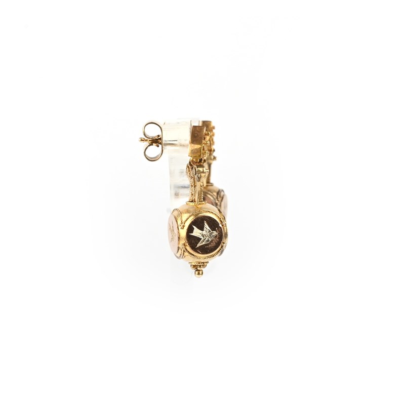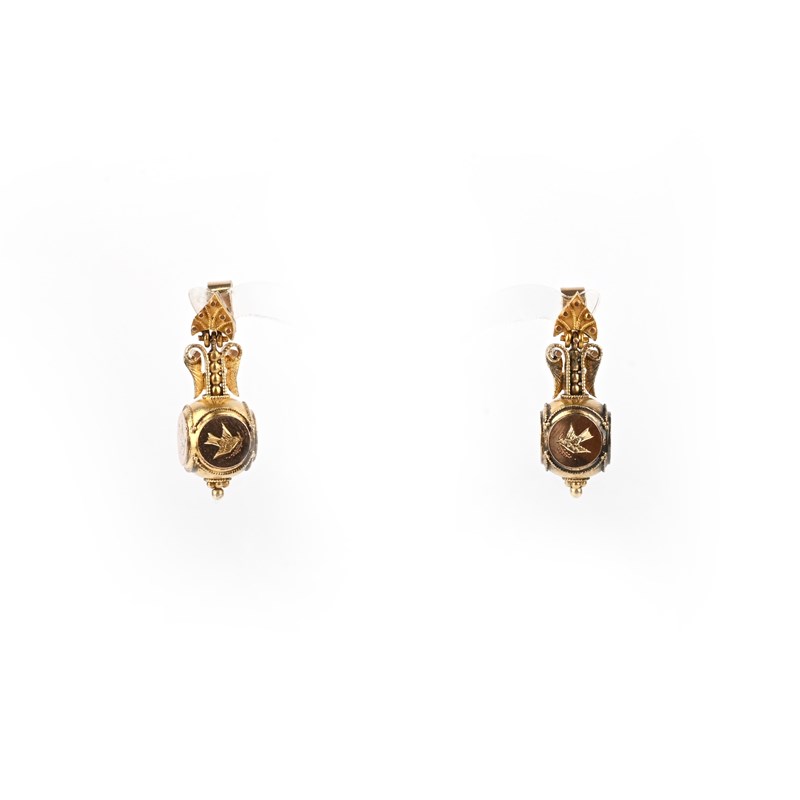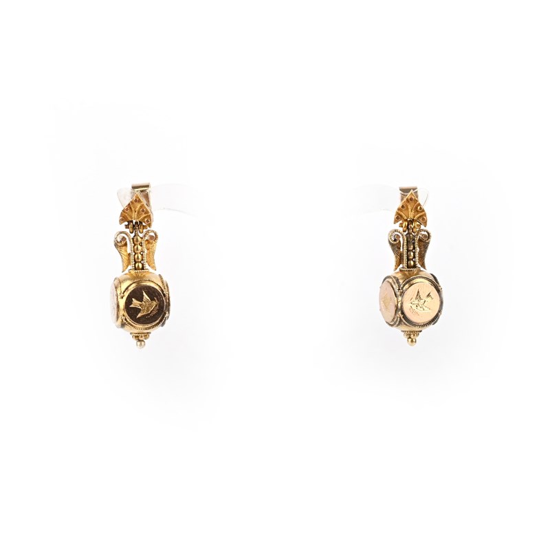 A pair of gold earrings, late 19th century, composite, composed of sectioned gold scroll surmounts suspending a cube motif, each side with a circular panel depicting a bird in flight, later post fittings, length 2.9cm