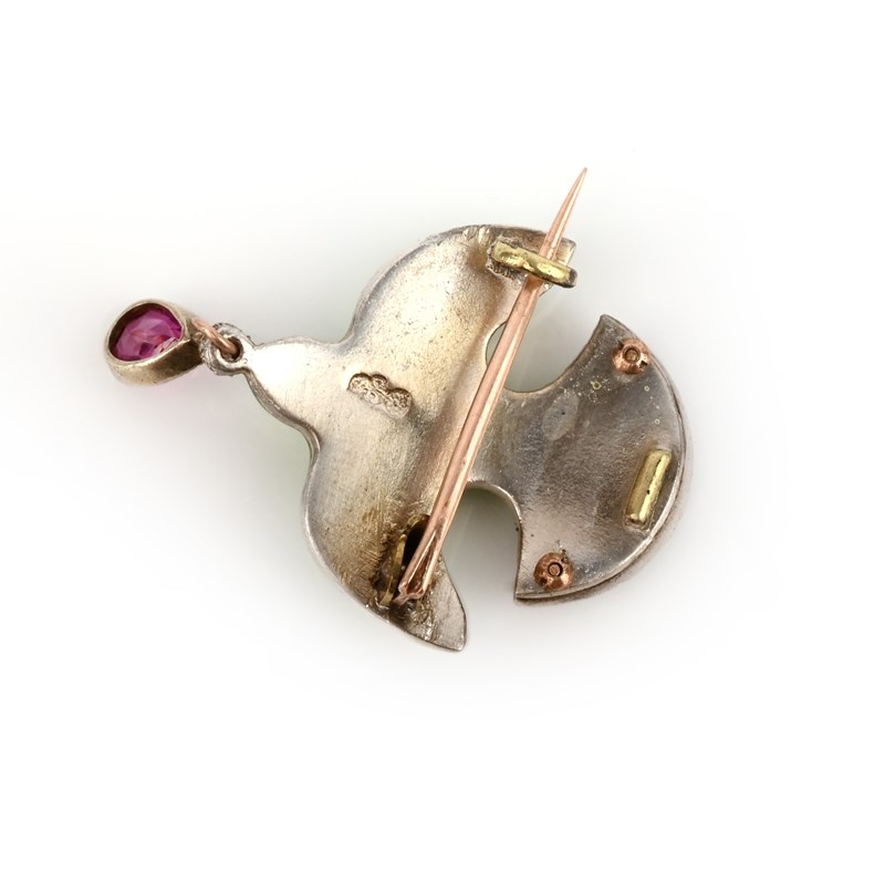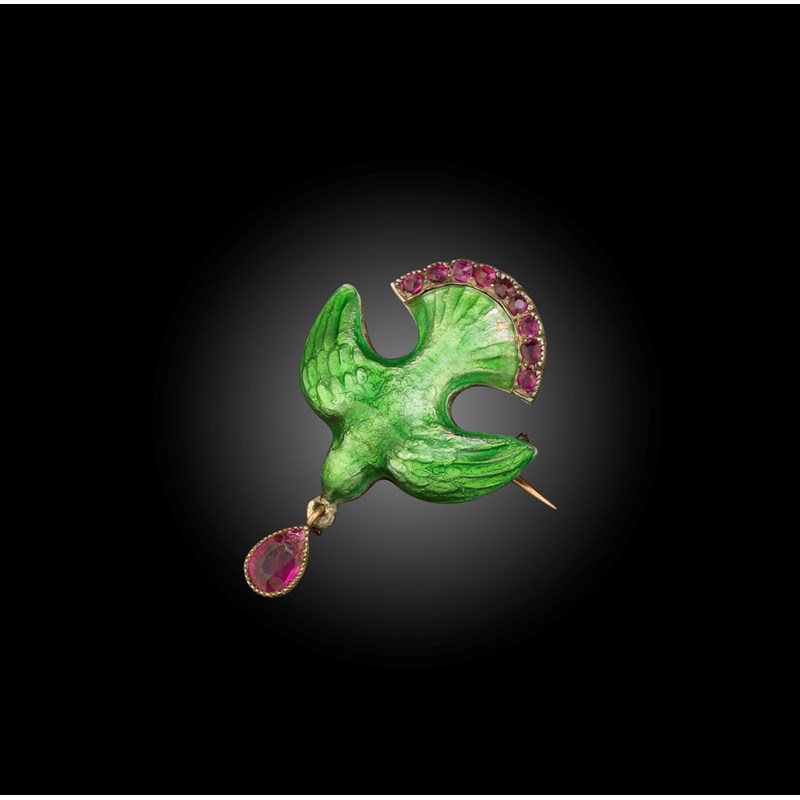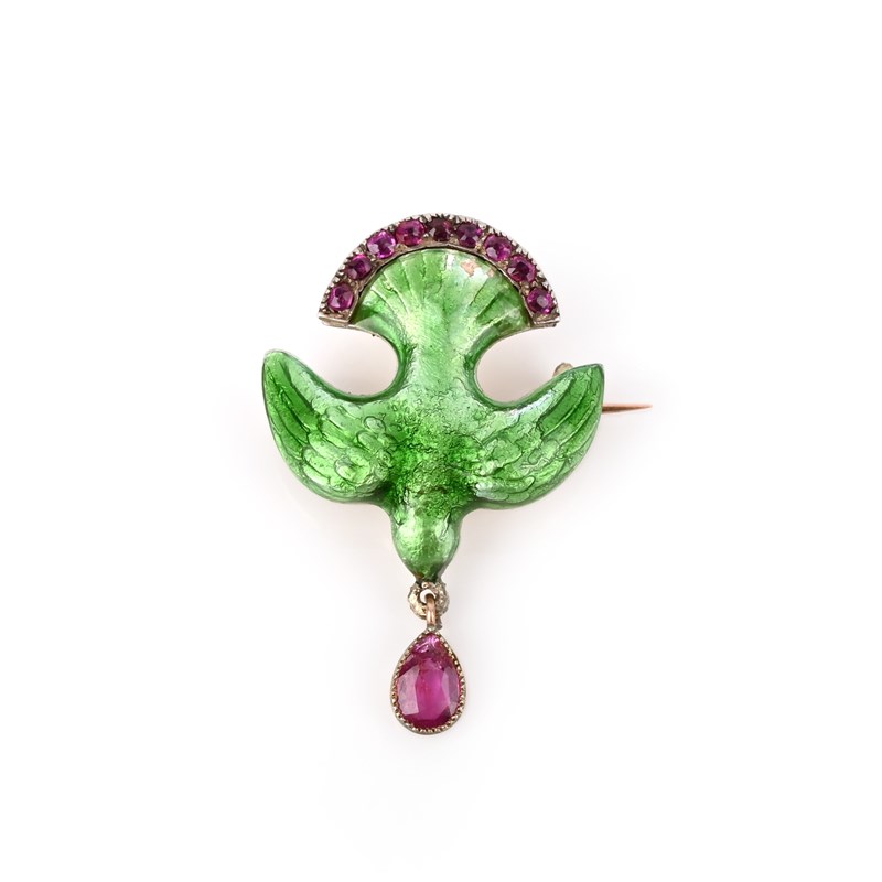 Child & Child, an enamel and ruby 'Saint Esprit' brooch, circa 1900, the silver brooch modelled as a dove in flight, suspending a pear-shaped ruby from its beak, its body applied with green basse taille enamel, its tail set with cushion-shaped rubies, length 3.5cm