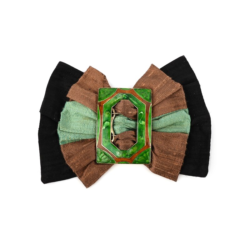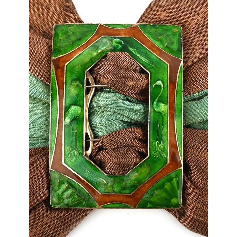 Child & Child, a silver and enamel buckle, circa 1900, of rectangular outline, applied with green and yellow ochre basse taille enamel over a design of flamingos, the corners with fan motifs, measuring 5.4 x 3.8, mounted with a bow