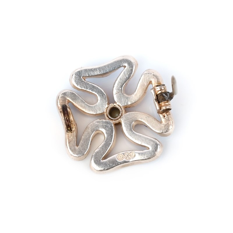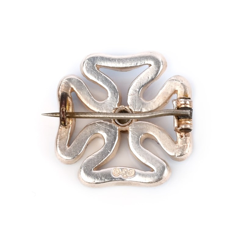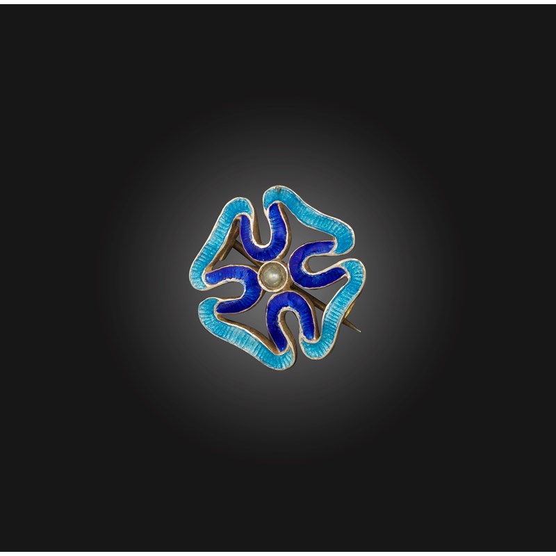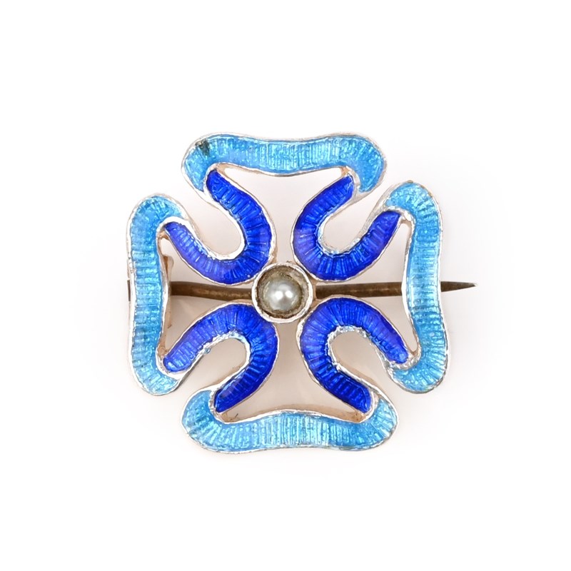 Child & Child, a silver, enamel and seed pearl brooch, circa 1900, designed as a ribbon scroll in the form of a Maltese cross, applied with blue basse taille enamel and centred on a half seed pearl, length 2.1cm, maker's mark for Child & Child