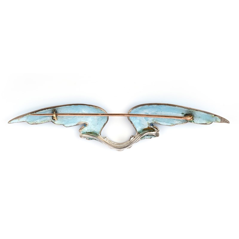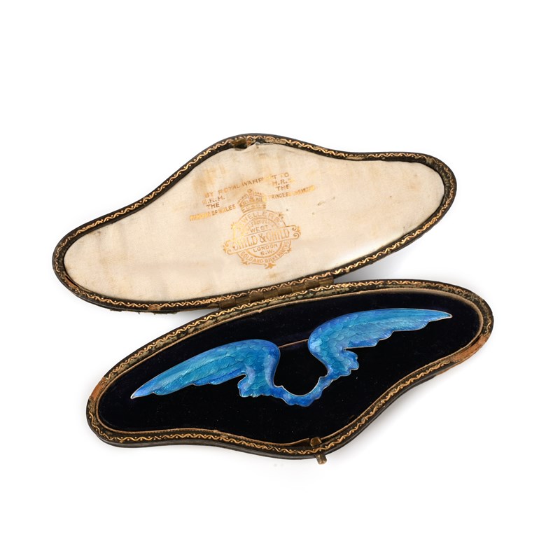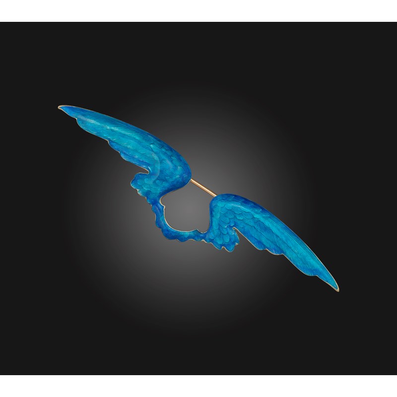 Child & Child, an enamel brooch, circa 1900, designed as a pair of wings applied with blue basse taille enamel, wingspan 9.8cm, maker's mark for Child & Child, fitted case stamped Child & Child