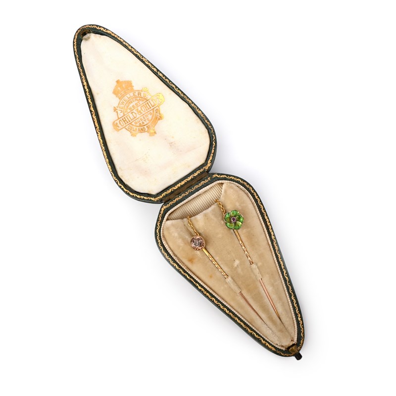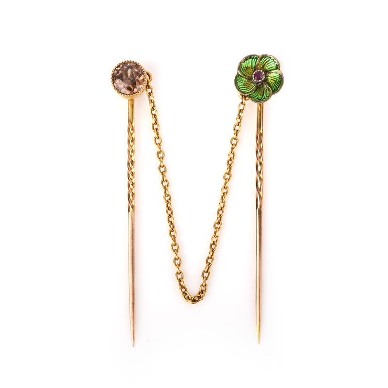 Child & Child, two joined stick pins, circa 1900, one designed as a flower applied with green and yellow basse taille enamel, the centre set with a ruby, the other set with a circular-cut zircon of peach tint, connected by a chain, length 4.9cm each, maker's marks for Child & Child, fitted case stamped Child & Child
