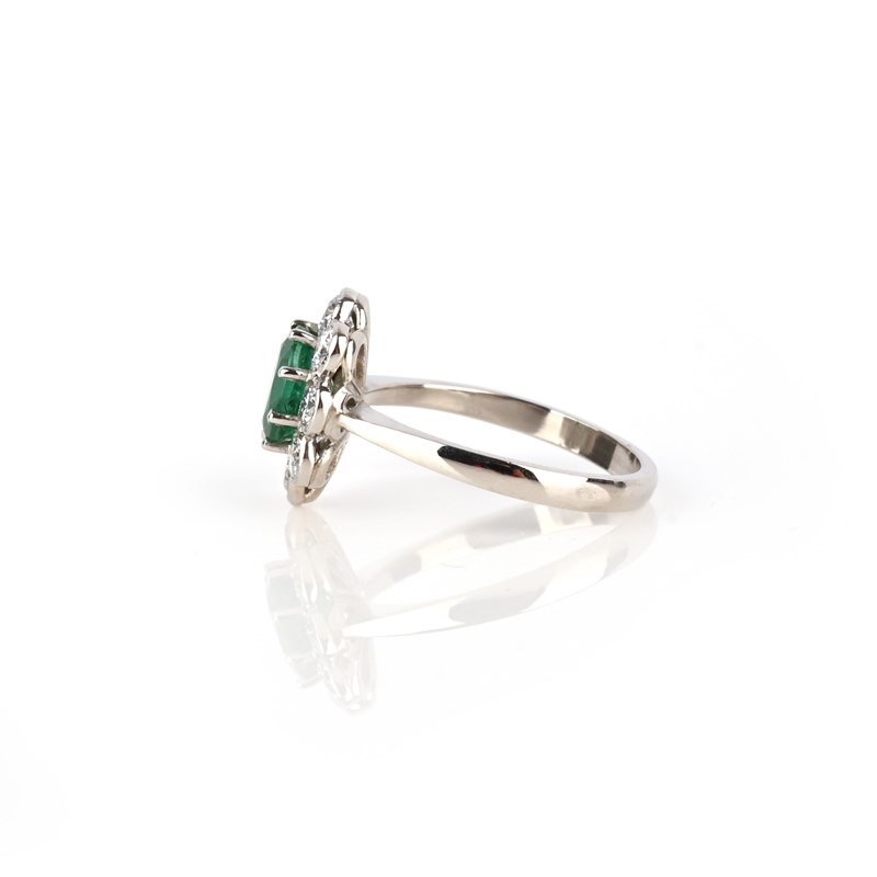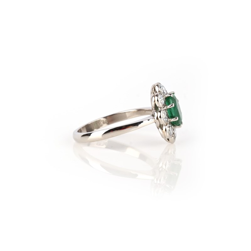 An emerald and diamond cluster ring, the oval-shaped emerald weighs 0.95cts, set within a surround of round brilliant-cut diamonds weighing approximately 1.00ct in white gold, size O