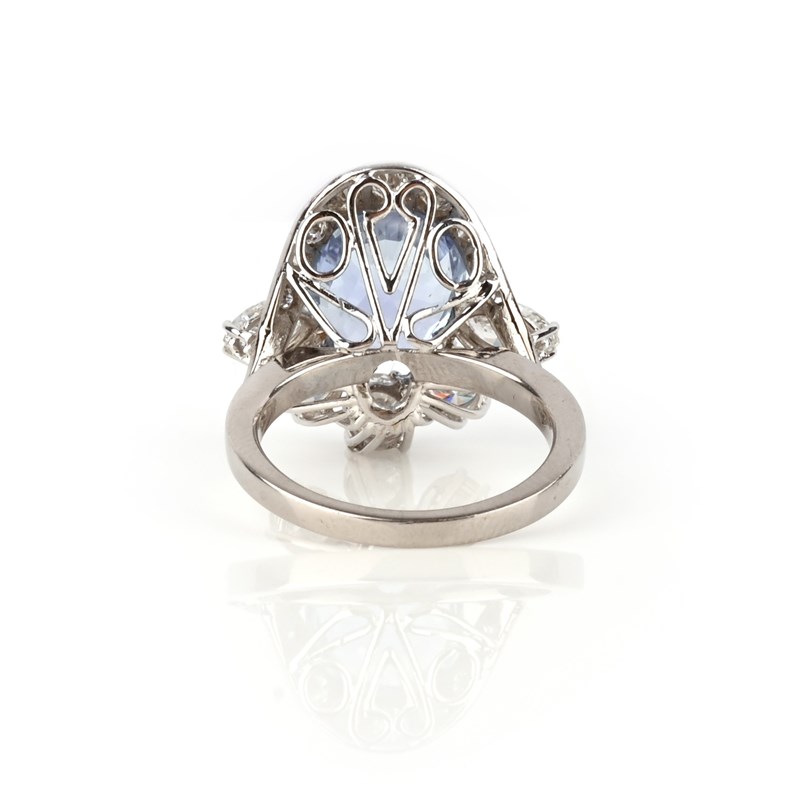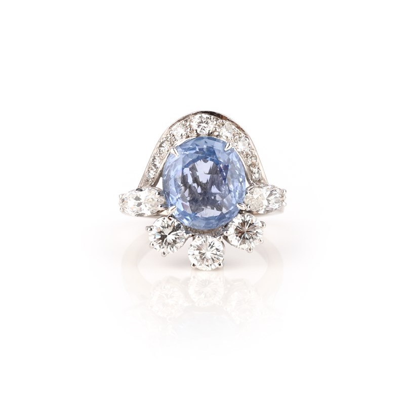 A sapphire and diamond ring, claw-set with an oval sapphire weighing 5.59 carats, within an asymmetrical border of brilliant-cut and marquise-shaped diamonds, size N