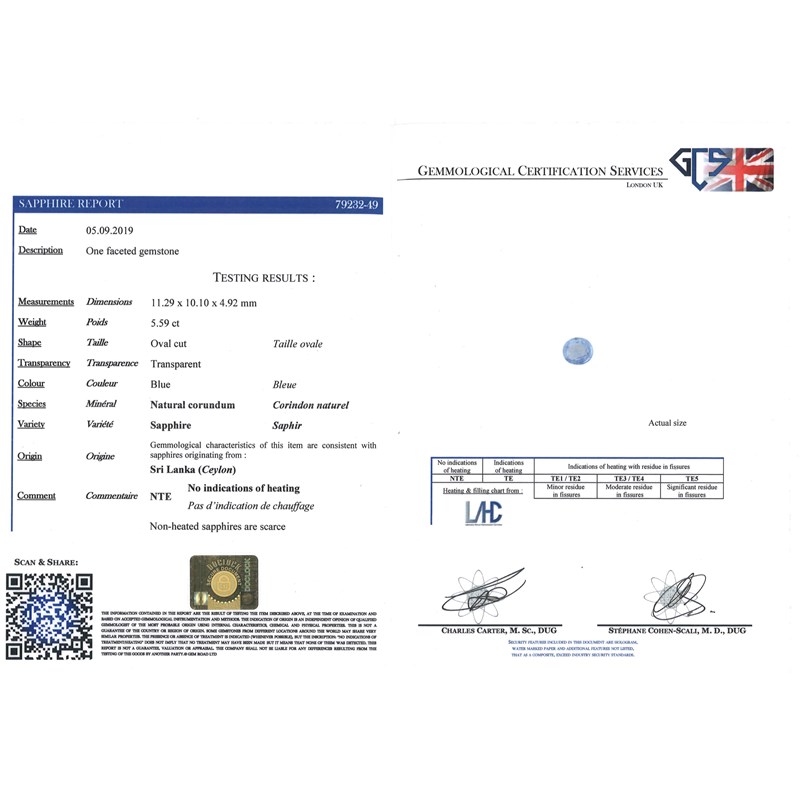 Accompanied by GCS report no. 79232-49, dated 5th September 2019, stating that the sapphire is of Sri Lankan (Ceylon) origin, with no indications of heat treatment.