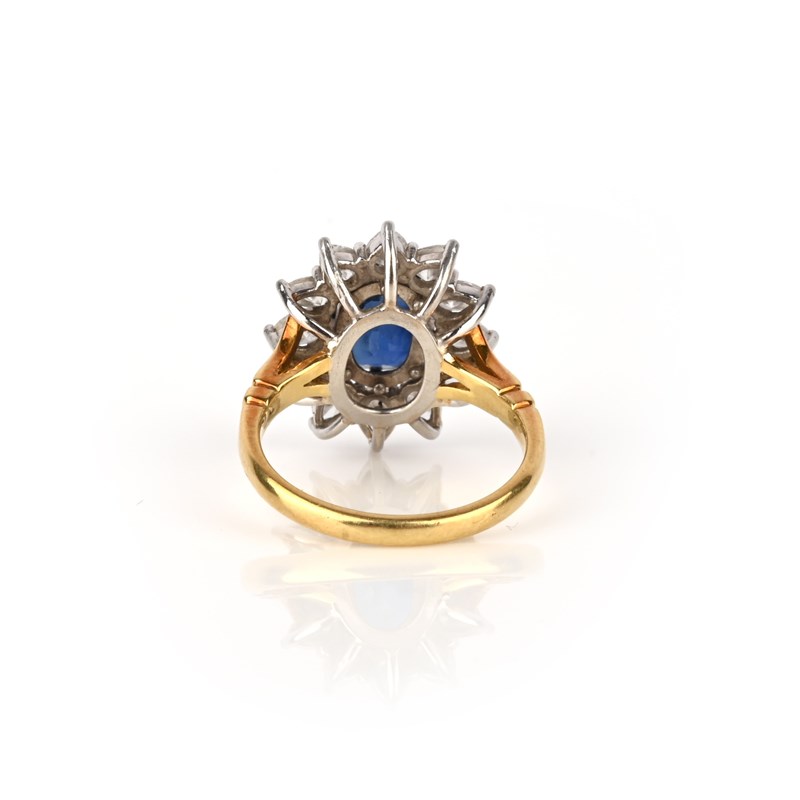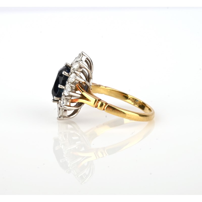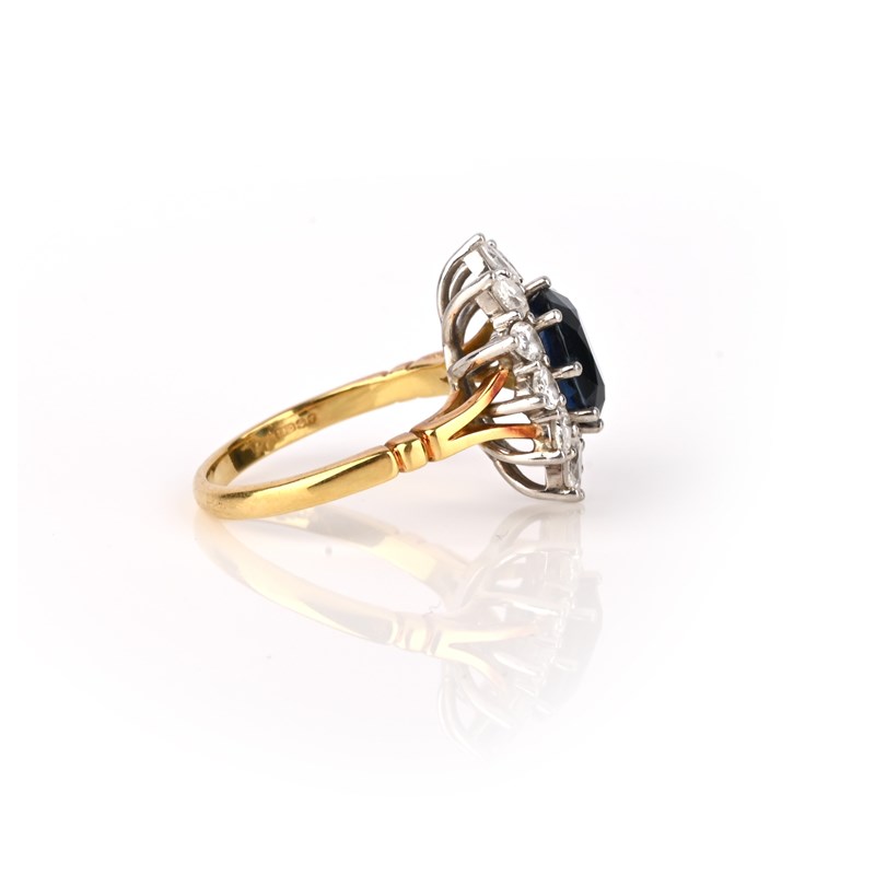 Asprey, a sapphire and diamond ring, claw-set with an oval sapphire within a border of pear-shaped diamonds, size N, British hallmarks for 18ct gold, stamped APLC for Asprey