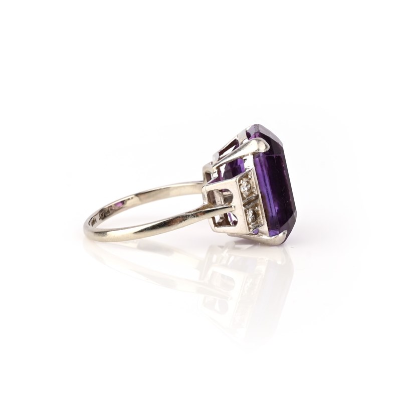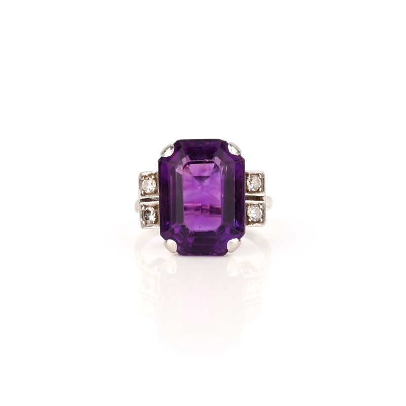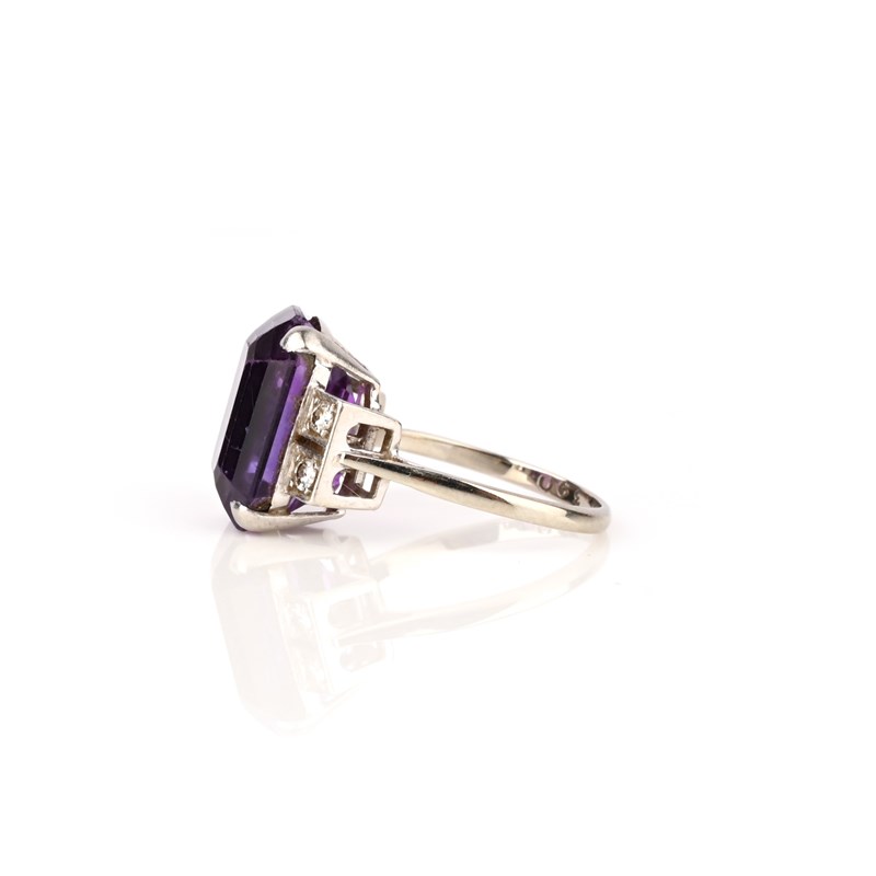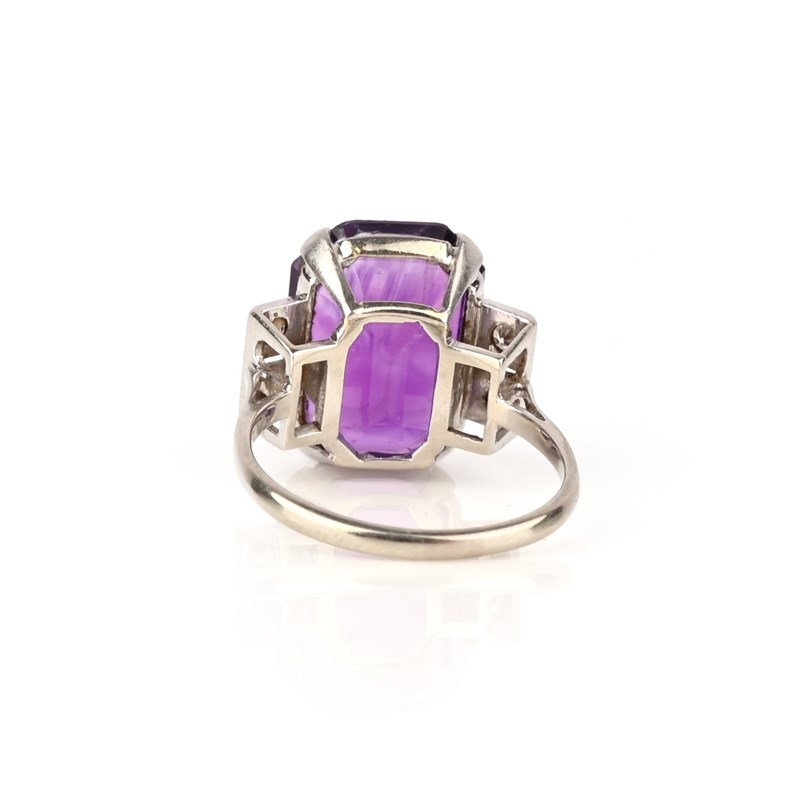 An amethyst and diamond ring, claw-set with a step-cut amethyst, to shoulders set with circular-cut diamonds, mounted in platinum and white gold, size M1/2, stamped PLAT 18CT, numbered 390