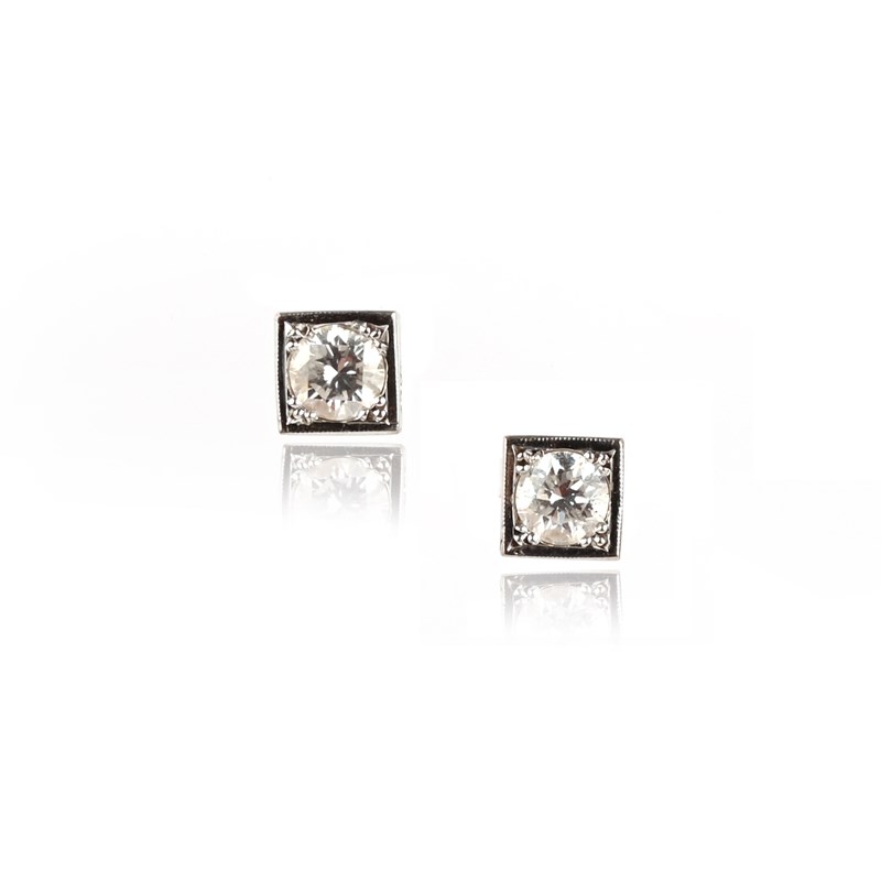 A pair of diamond stud earrings, the round brilliant-cut diamonds millegrain-set in square 18ct white gold surrounds, 7mm wide, post fittings
