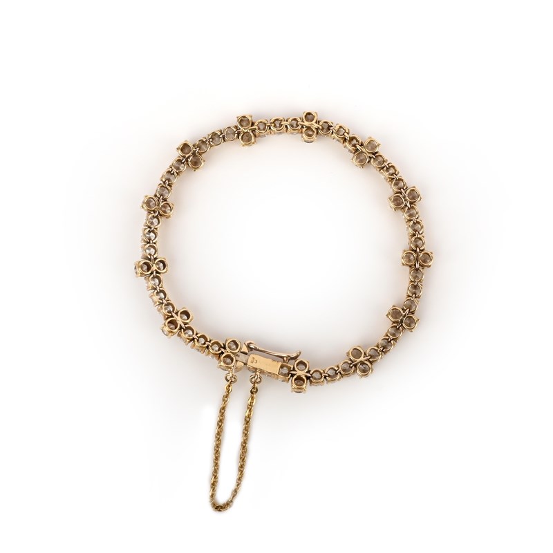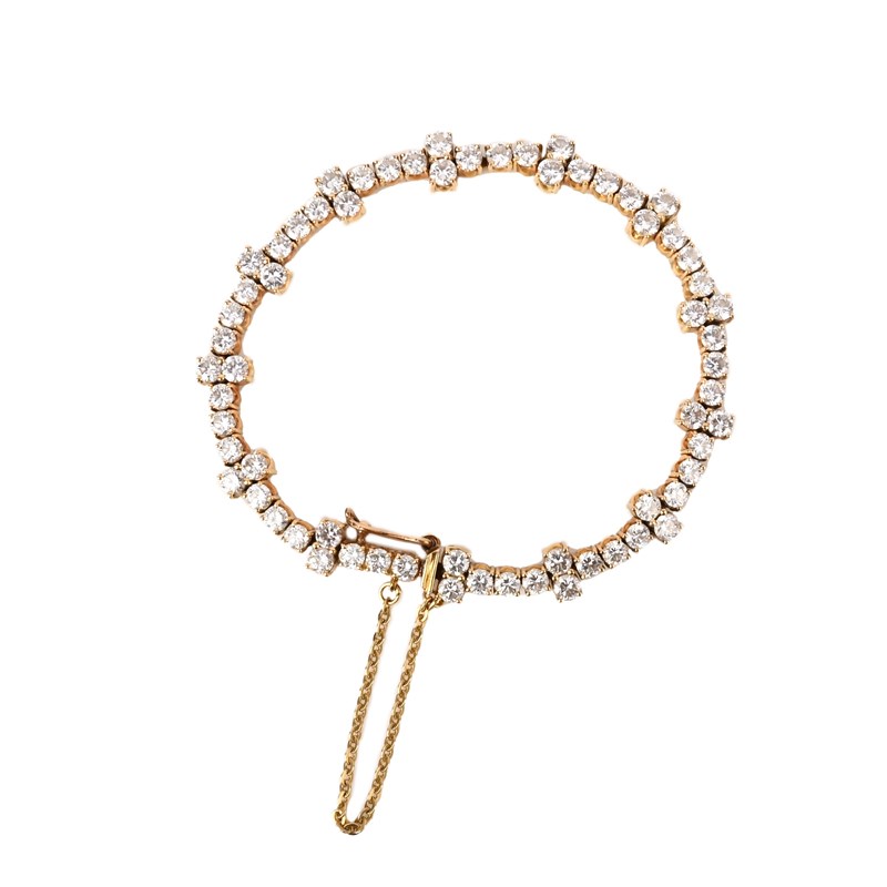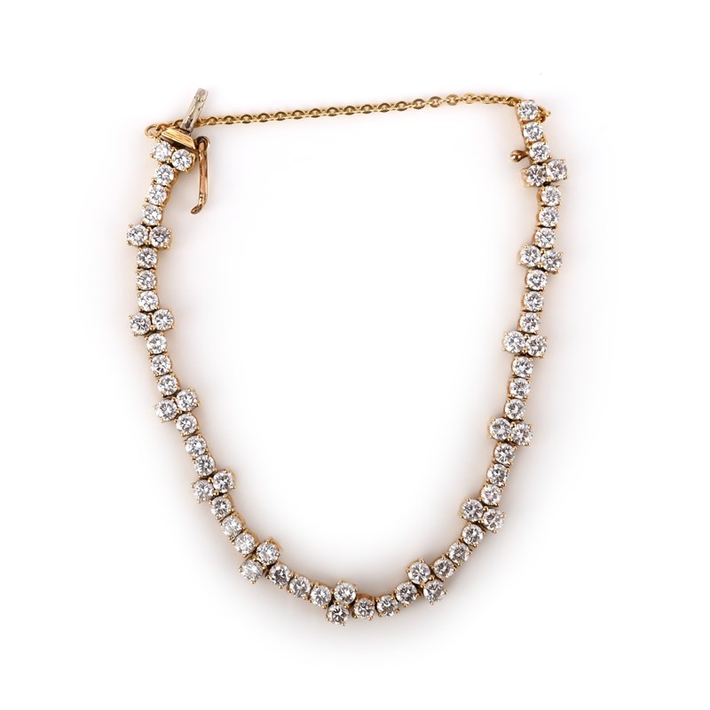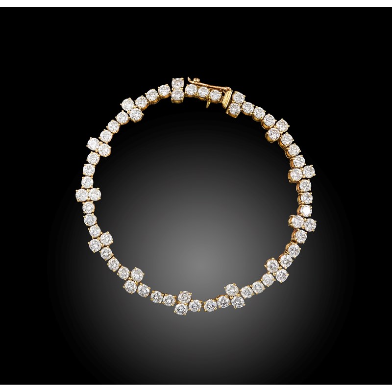 A diamond line bracelet, set with round brilliant-cut diamonds separated with pairs of round brilliant-cut diamonds in yellow gold, 18cm long