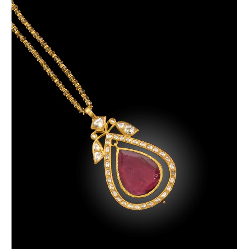 A garnet and diamond pendant necklace, India, set with a pear-shaped flat-cut garnet in a foiled setting, within a border of lasqué diamonds, the reverse applied with blue, red, green and white enamel in floral designs, mounted in gold, to a necklace of faceted citrines, necklace length 43cm, pendant length 7.1cm