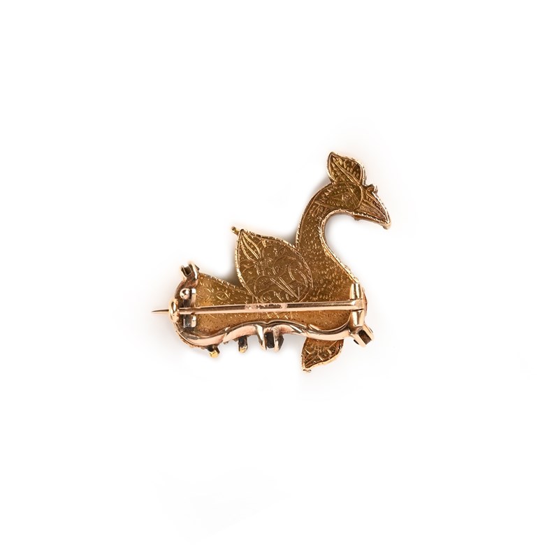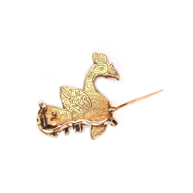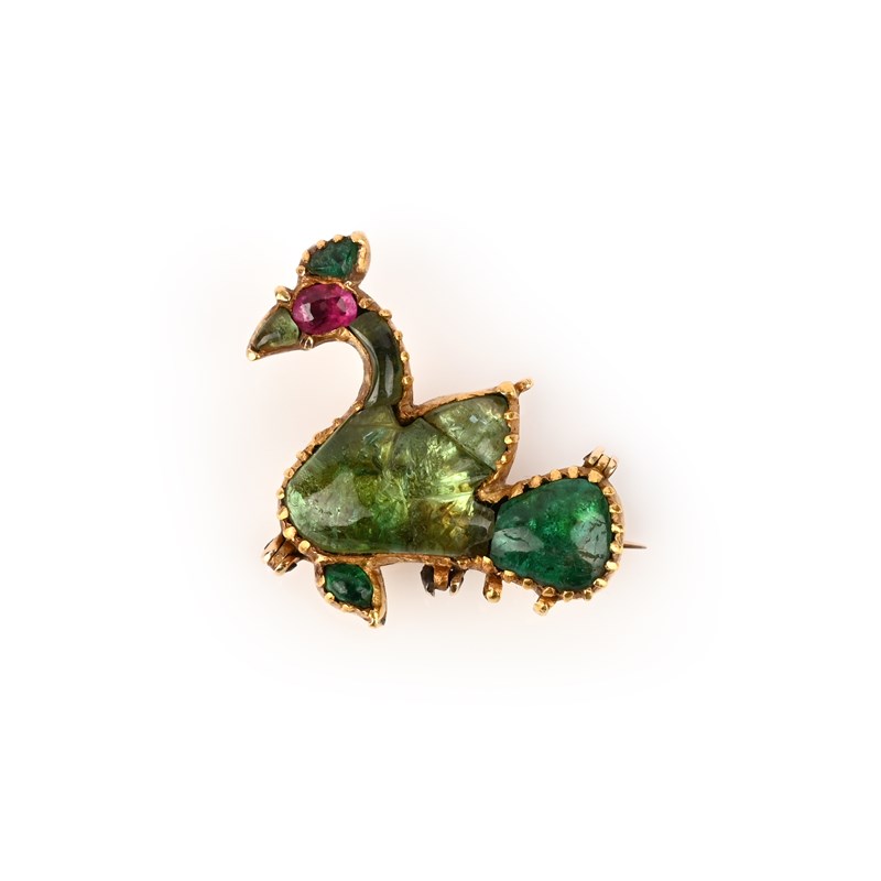 An emerald, ruby and foiled gemstone brooch, India, 19th century, designed as a bird, set with carved emeralds and foil-backed green gemstones, its eye set with an oval ruby, mounted in gold, the reverse with incised decoration depicting a bird, length 3.1cm, later brooch fittings
