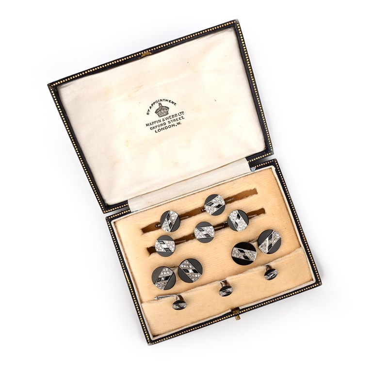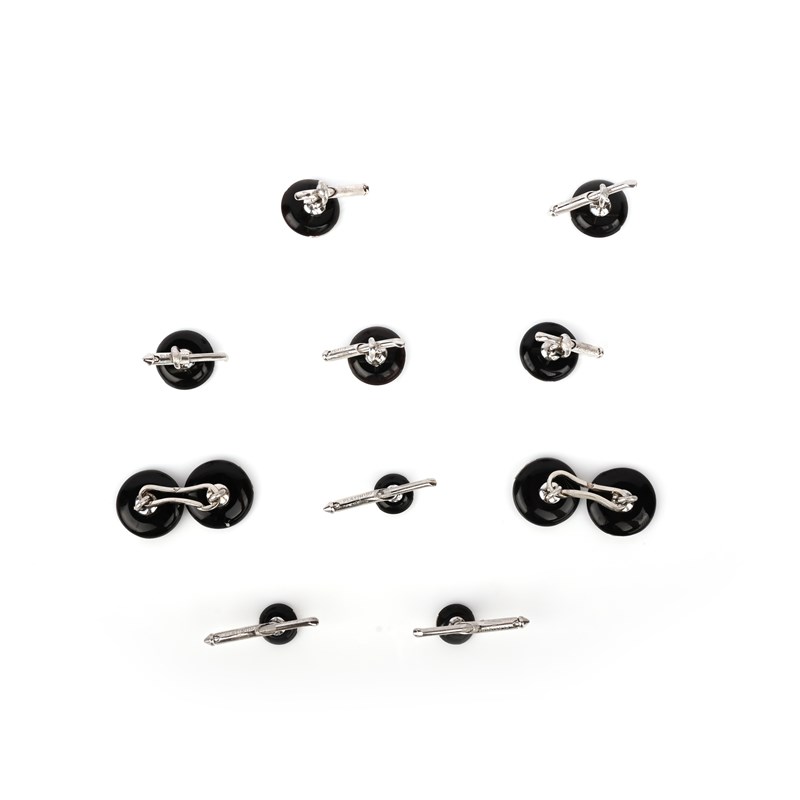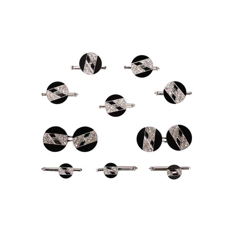 An Art Deco onyx and diamond dress set, comprising cufflinks, five buttons and three studs, each onyx disc with a central band of diamonds and onyx millegrain-set in platinum, French control marks, case