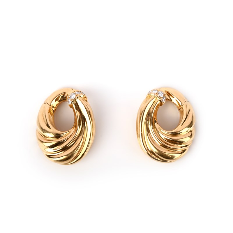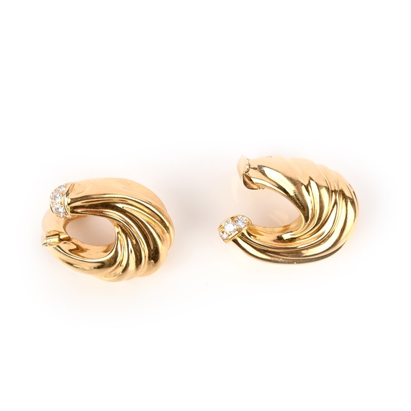 Van Cleef & Arpels, a pair of diamond-set gold earrings, set with a demi-lune of diamonds on fluted yellow gold, signed and numbered B3282A6, with maker's lozenge, hinged clip fittings, 3cm high