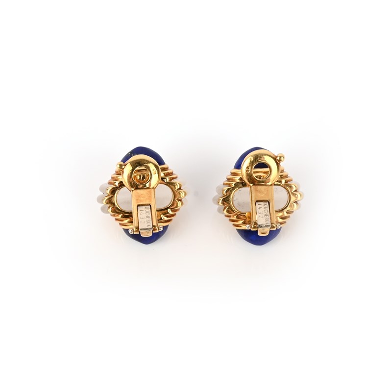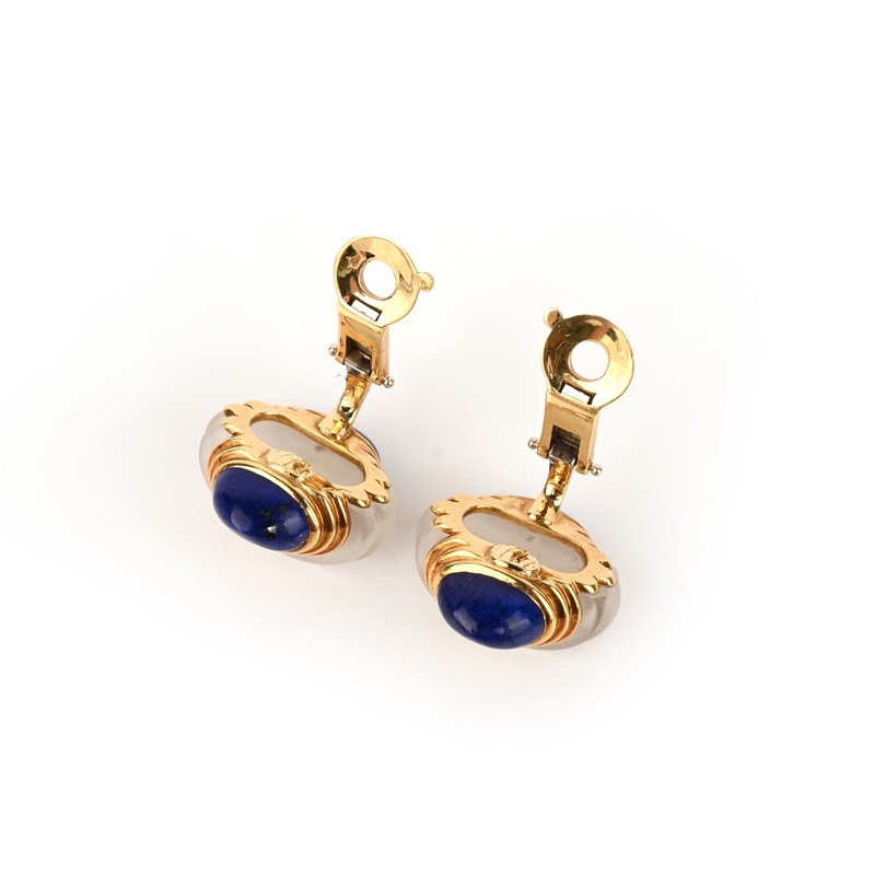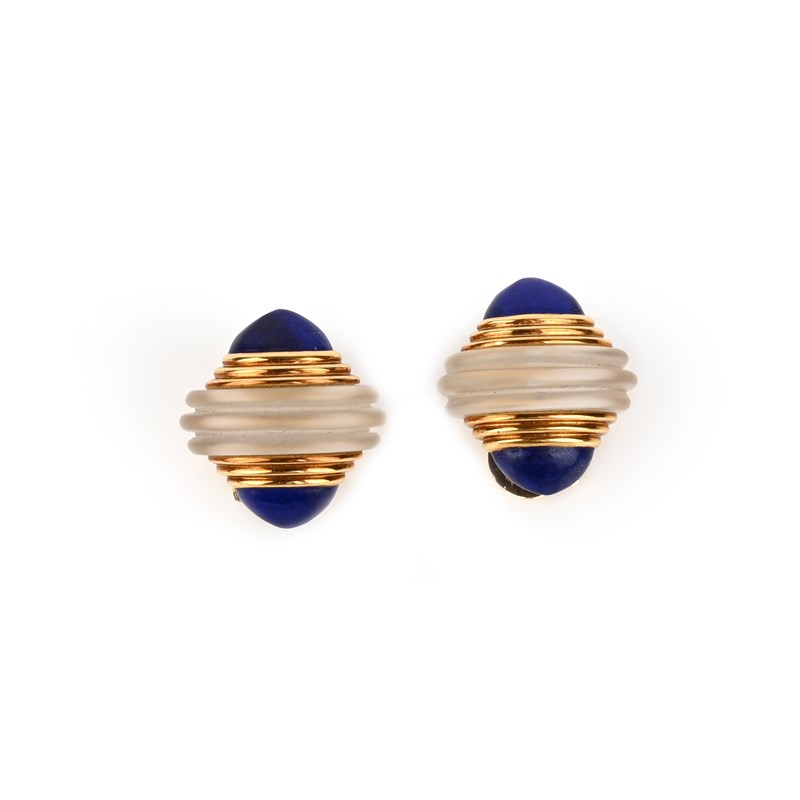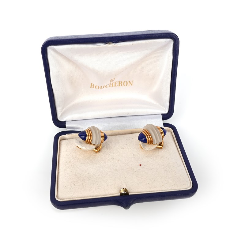Boucheron, a pair of Lapis Lazuli and rock crystal gold earrings, of fluted rock crystal and gold design set with lapis lazuli terminals, signed Boucheron numbered 1432 and with maker's mark TEB, clip fittings, 2.2cm high, Boucheron case