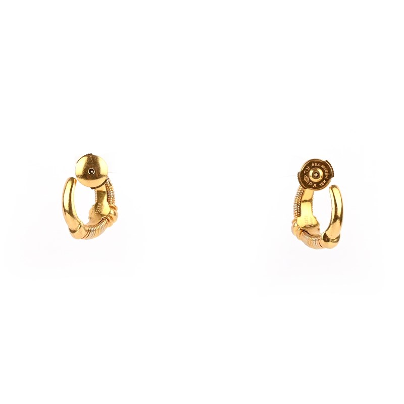 Cartier, a pair of gold hoop earrings, each decorated to the front with coild bicoloured gold wire, length 1.8cm. post fittings, each signed Cartier, numbered 590258, stamped 750
