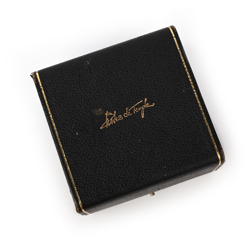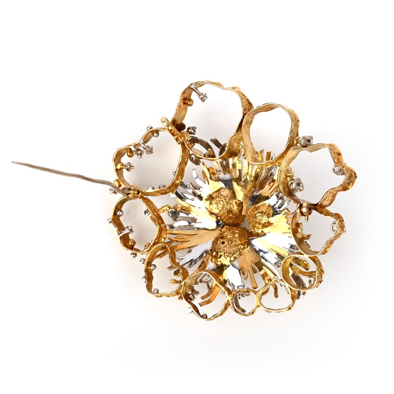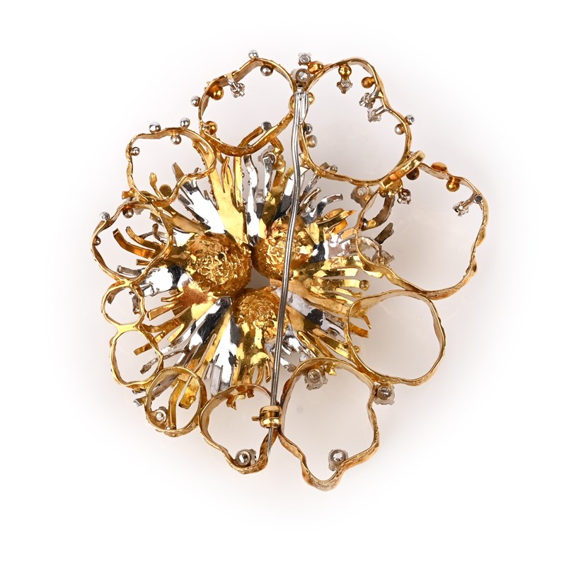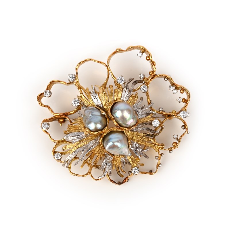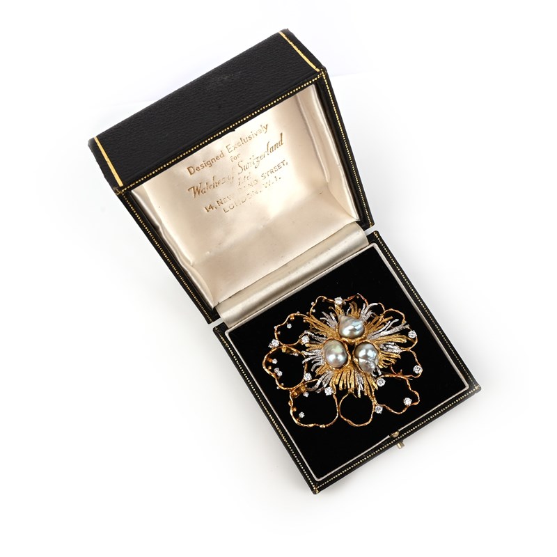 Attributed to Charles de Temple, a cultured pearl and diamond brooch/pendant, 1970s, of abstract design in bicoloured, textured gold, centring on a trio of grey baroque cultured pearls, accented with brilliant-cut diamonds, measuring 7.2 x 6.4cm, unsigned, case stamped Charles de Temple, the interior stamped 'Designed Exclusively for Watches of Switzerland'